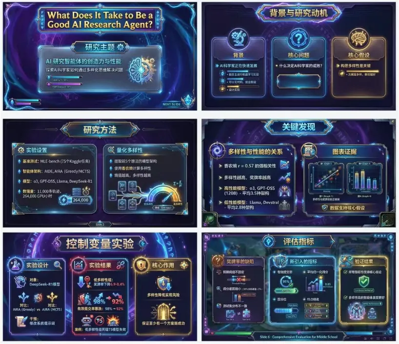 渐变色便当盒风格 Lovart PPT 生成提示词:帮我根据下面这个论文介绍做一套中学生都能理解的PPT。先写1个PPT大纲,规划出每一页的PPT的内容。然后将每一页的PPT内容分别扔给Nana Banana pro生成对应页面的PPT,需要确保风格一致。PPT的具体风格应该为Bento grid layout,苹果总结幻灯片风格,模块化设计,圆角方块,UI 界面仪表盘,柔和阴影,有组织的构图,信息图表风格,深色模式(或浅色模式),科技产品功能总结,等轴测视图。文字和图像都由 Nano Banana Pro 生成,另外不要将PPT 变成一整张图,一页一张生成。文章内容为:「此处填写文章内容」