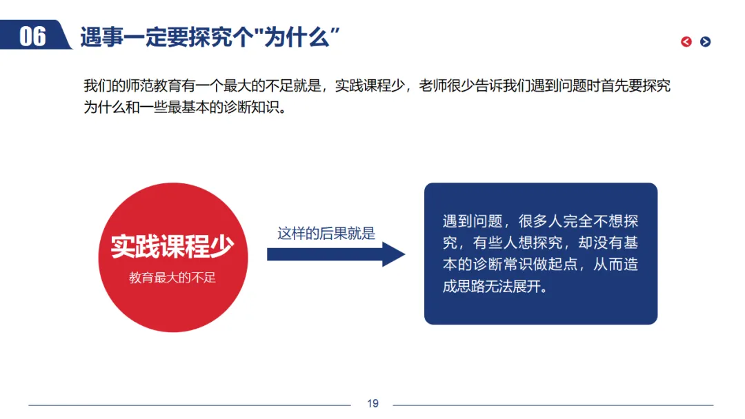 我们的师范教育有一个最大的不足就是实践课程少,老师很少告诉我们遇到问题时首先要探究为什么和一些最基本的诊断知识。遇到问题,很多人完全不想探究,有些人想探究,却没有基本的诊断常识做起点,从而造成思路无法展开。所以,大家遇到事情或问题,一定要问“为什么”,并且要假设多个原因,然后再去做诊断。疑问是研究的前提,没有“为什么”,教师就永远被关在教育科学研究的大门外。我们还要通过查阅一些涉及教育案例分析方面的书籍,学习和掌握一些基本的专业知识,提高自己的诊断能力。