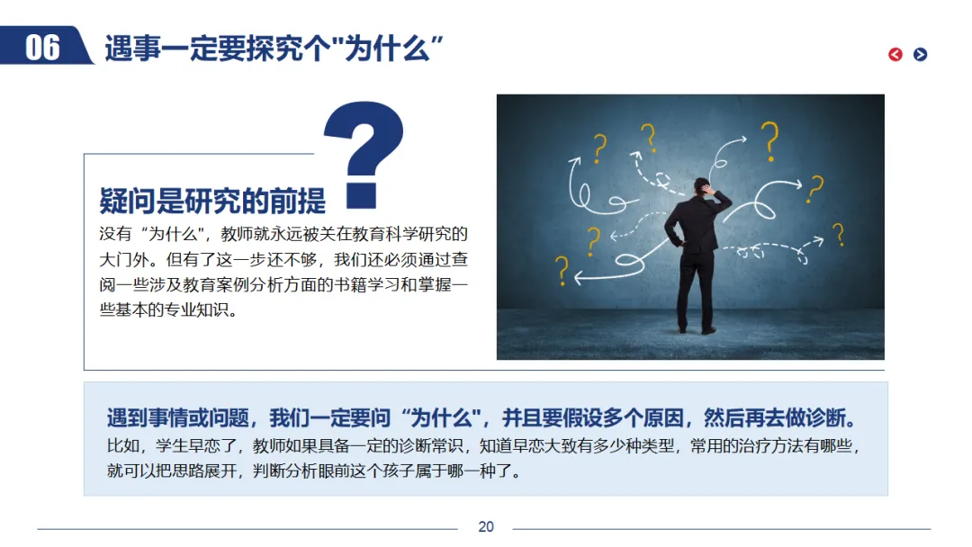 遇到一件事情,一定要刨根问底,假设多种原因,一个一个排除,最后锁定的那个原因一定能较好地解释所有的疑问,而且合乎逻辑。有些问题即使已经解决了,也还是要问“为什么”,因为你很可能碰巧办对了,歪打正着,不搞清为什么,你的教育水平就没有得到提高。例如,学生早恋了,教师如果具备一定的诊断常识,知道早恋大致有多少种类型,常用的治疗方法有哪些,就可以把思路展开,判断分析眼前这个孩子属于哪一种,从而采取针对性的教育措施。