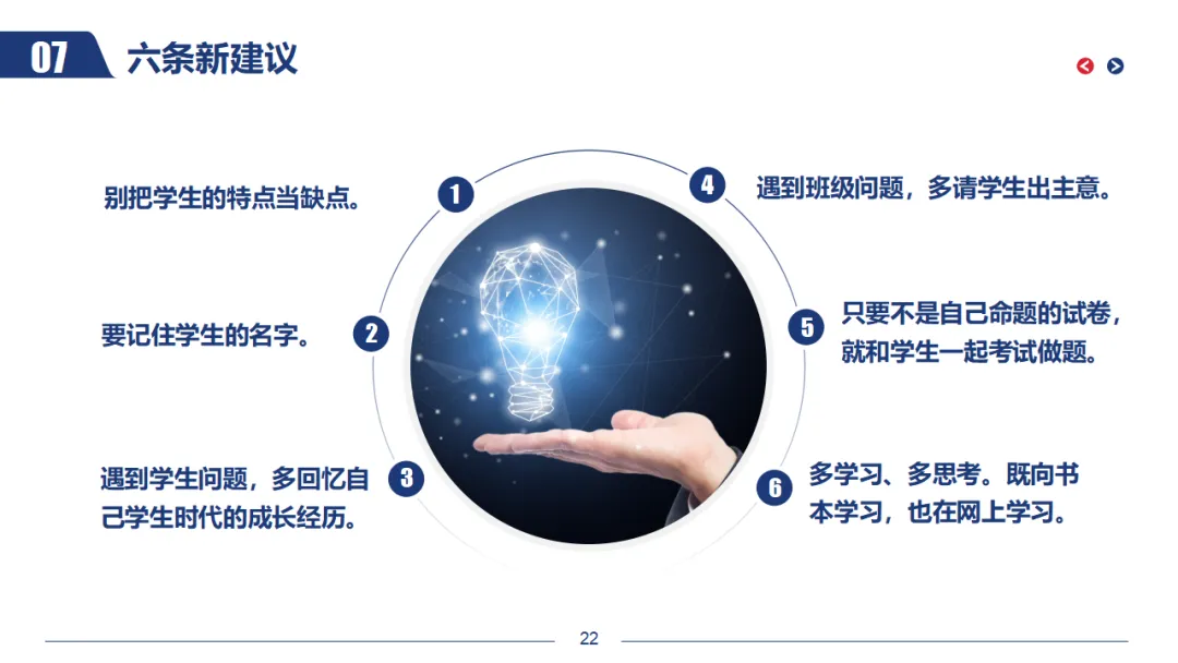 6.多学习、多思考:既向书本学习,也在网上学习。不断更新自己的知识结构,提升自己的教育理念和教学方法。