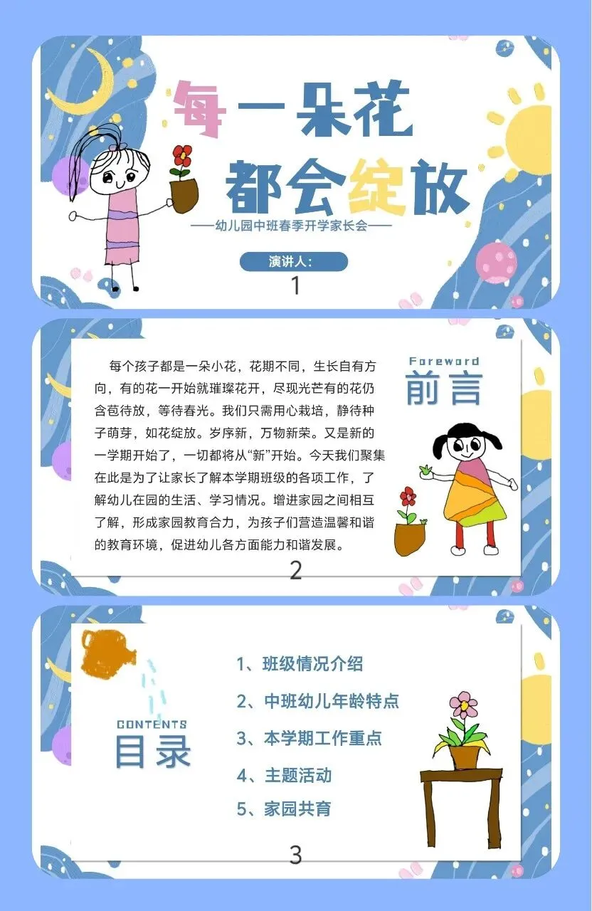 每个孩子都是一朵小花,花期不同,生长自有方向,有的花一开始就璀璨花开,尽现光芒有的花仍含苞待放,等待春光。我们只需用心栽培,静待种子萌芽,如花绽放。岁序新,万物新荣。又是新的一学期开始了,一切都将从“新”开始。今天我们聚集在此是为了让家长了解本学期班级的各项工作,了解幼儿在园的生活、学习情况。增进家园之间相互了解,形成家园教育合力,为孩子们营造温馨和谐的教育环境,促进幼儿各方面能力和谐发展。