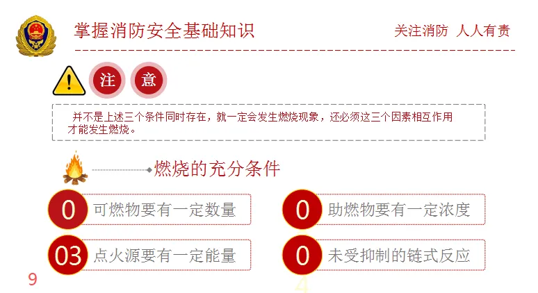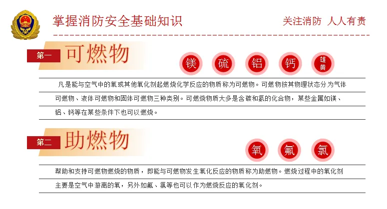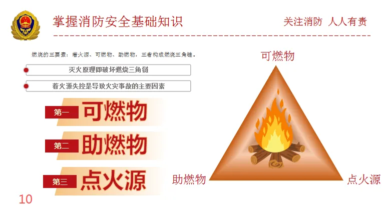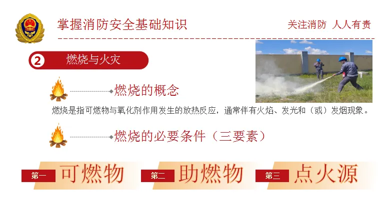 消防火灾燃烧的三要素是:可燃物、助燃物、点火源