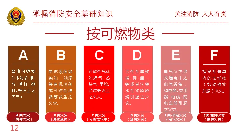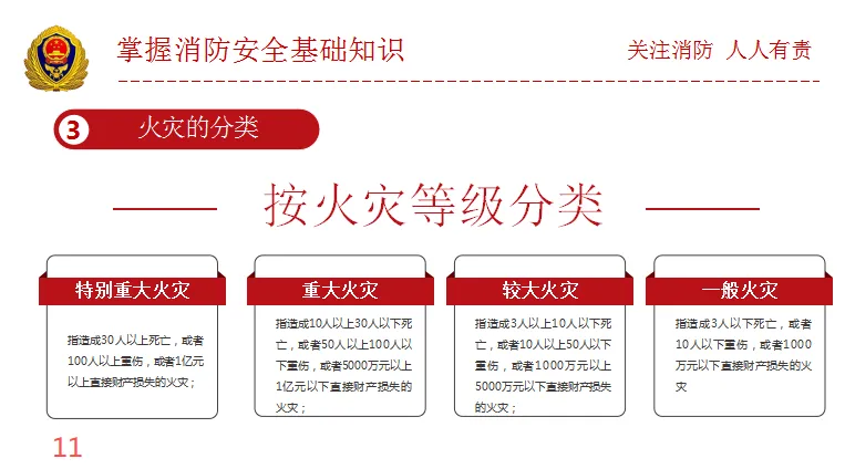 消防火灾的分类:按火灾等级分一般火灾、较大火灾、重大火灾、特别重大火灾