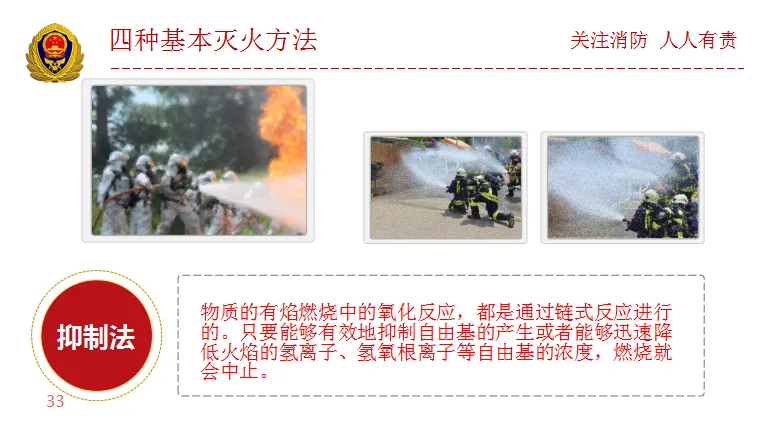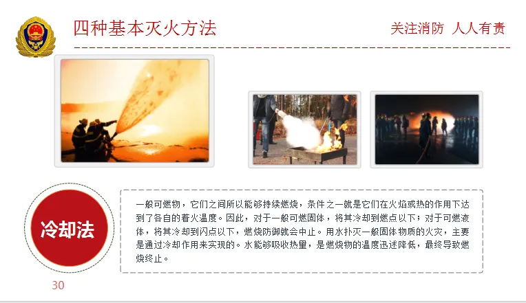 冷却法是用水扑灭一般固体物质的火灾,主要是通过冷却作用来实现的。水能够吸收热量,是燃烧物的温度迅速降低,最终导致燃烧终止。