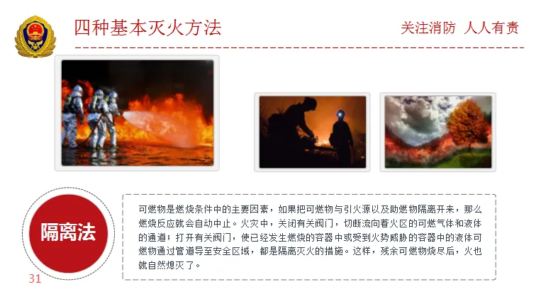 隔离法灭火中,可燃物是燃烧条件中的主要因素,如果把可燃物与引火源以及助燃物隔离开来,那么燃烧反应就会自动中止。