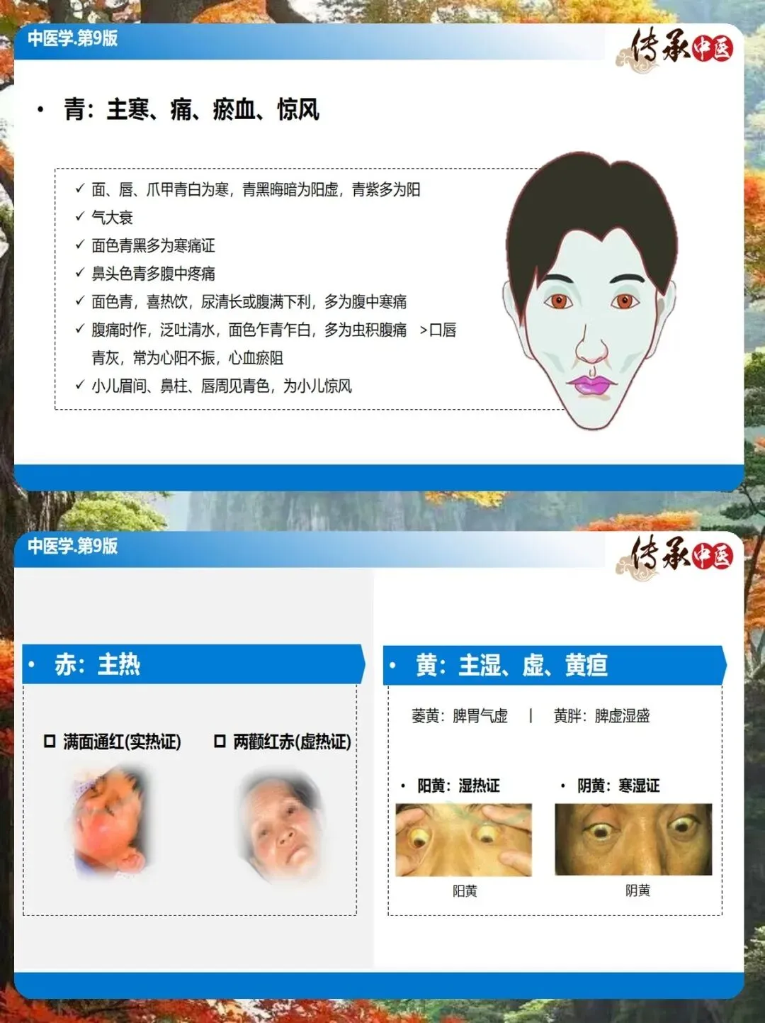 其次,是望面色。正常人的脸色是微黄透红、明润光泽的。一旦生病,脸色就会出现“病色”。这里有一个实用的判别口诀:青色主寒、痛、瘀血,比如小孩眉间发青往往是惊风;赤色主热,满面通红是实热,两颧潮红则是虚热;黄色主湿、虚,脸色萎黄多是脾胃气虚;白色主虚、寒、失血,突然苍白冷汗往往是阳气暴脱;黑色主肾虚、水饮、瘀血,眼眶周围发黑常与肾虚水饮有关。