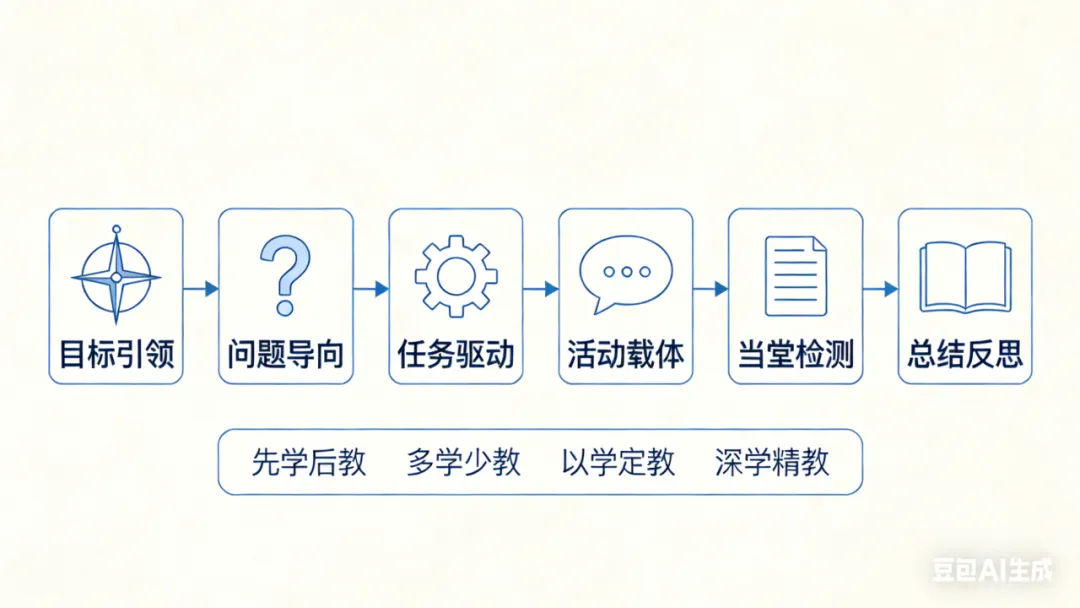 其根本目的在于通过变革教师的教学方式,优化学生学习方式,实现学生学习能力、学习质量和学习情感的全面提升。教学过程的基本思路是:目标引领—问题导向—任务驱动—活动载体—当堂检测—总结反思,其核心要素为:先学后教、多学少教、以学定教、深学精教。