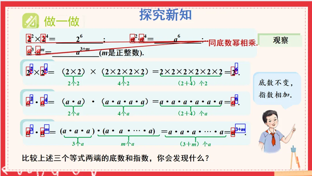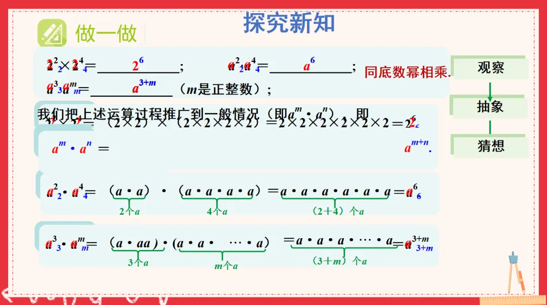 有了这些铺垫之后,我引导学生通过举例的方式,尝试用自己的语言描述什么是“同底数幂”、什么是“同底数幂的乘法”。由于前面的基础打得比较扎实,学生们很快便表达出了自己的想法。