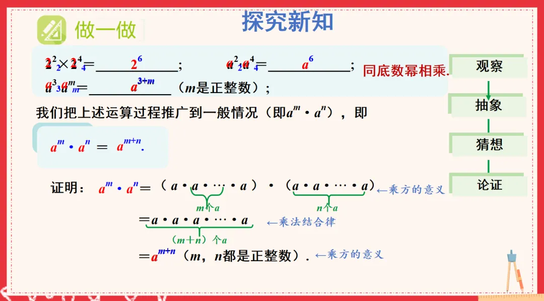 在此基础上,我引导学生尝试建立模型——用字母表示数,从而归纳出同底数幂相乘的运算法则。但我也指出,这仅仅是由具体数字运算推测出来的结果,还需要进一步论证它的普遍性。于是,我继续引导学生思考:如何从数学上证明这个法则?