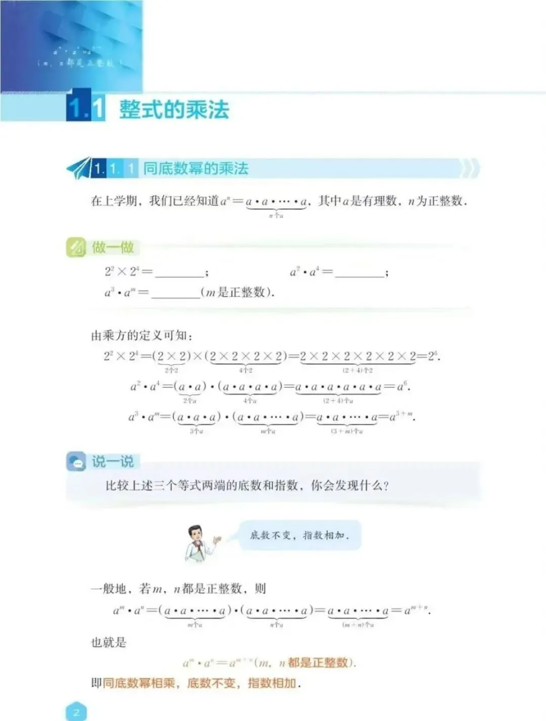 在上《1.1 .1同底数幂的乘法》这一课时,我遵循教材的编排顺序展开教学。我先带领学生回顾了乘方与幂的概念,并引入相关的数学文化知识,向学生介绍了“幂”这一名称的来源——“自乘之数曰幂”。在此基础上,我进一步强调了“底数”与“指数”的具体含义。