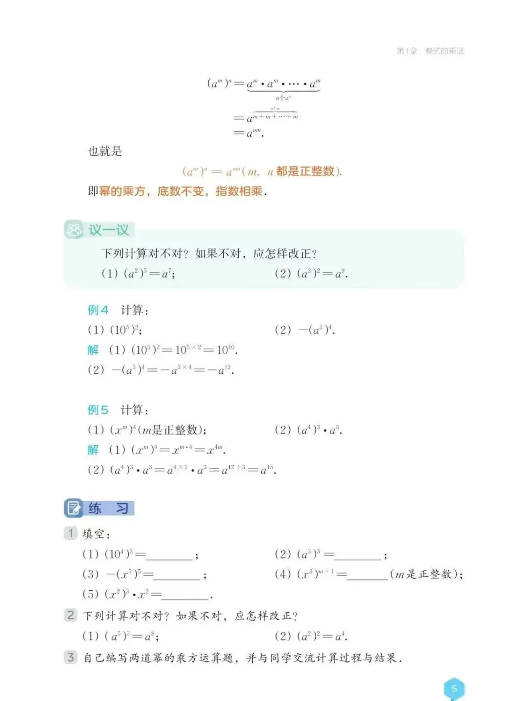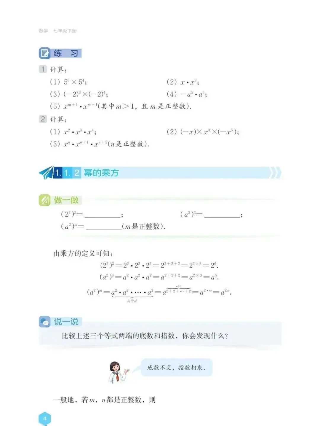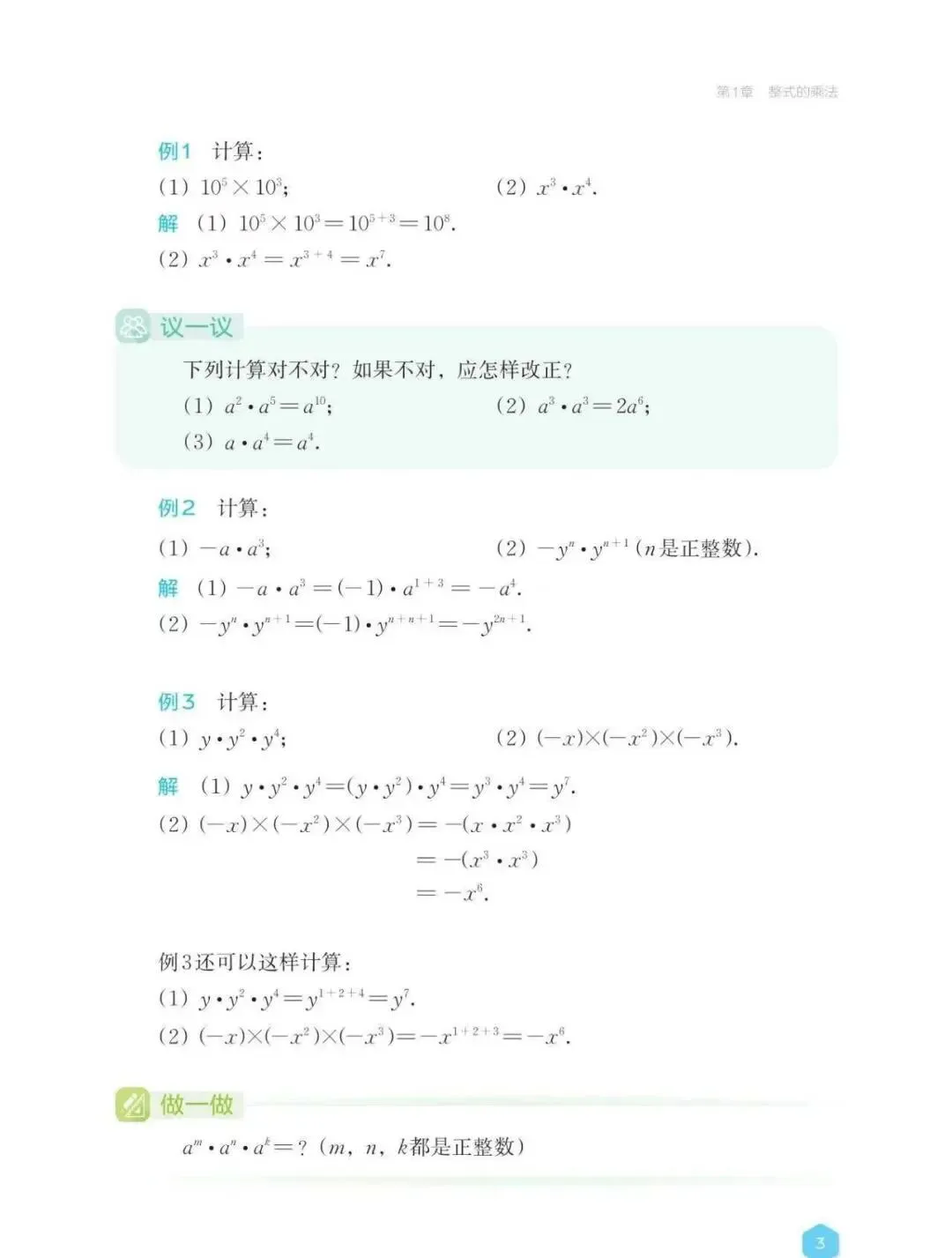 湘教版初中数学七年级下册的《1.1.1 同底数幂的乘法》《1.1.2 幂的乘方》《1.1.3 积的乘方》这三节课有一个共通之处:利用学生已有的经验,结合具体实例理解运算法则,并能运用法则进行计算。