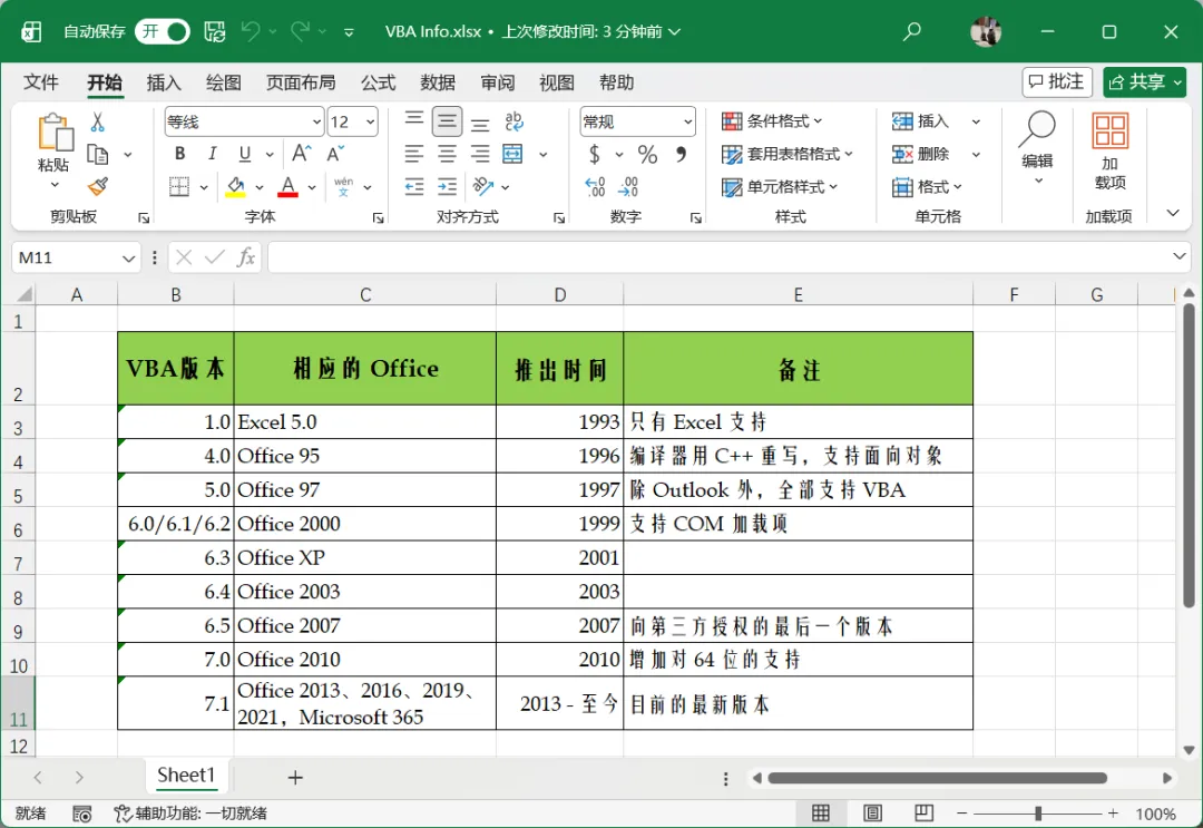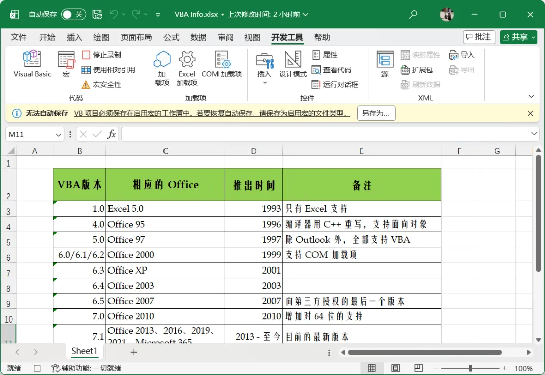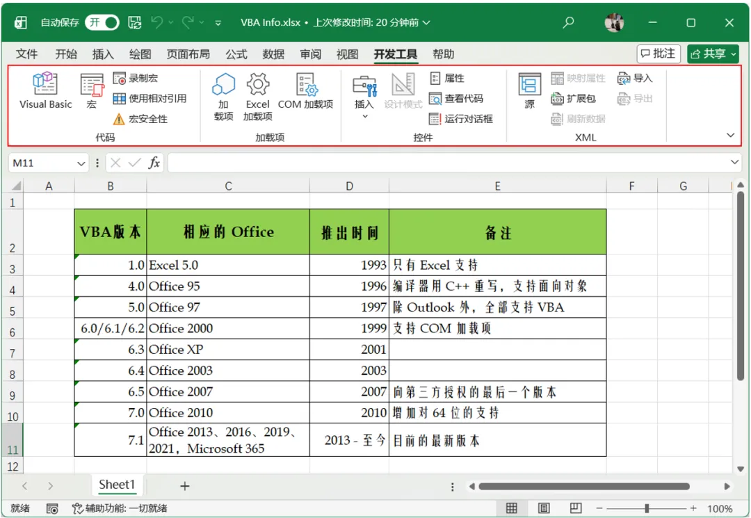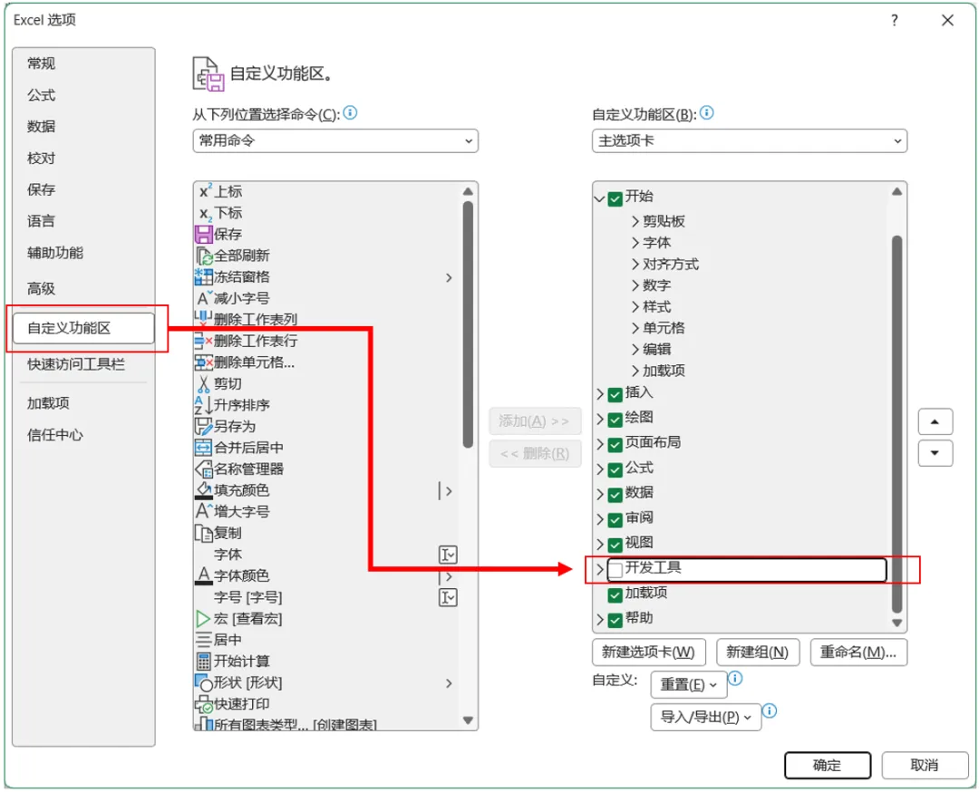 经过前面两篇引子之后,从今天开始正式进入对 VBA 编程的讨论,先从最基础的部分开始。要在 Excel 中进行 VBA 编程,首先必须开启“开发工具”(Developer)选项卡。我使用的版本是 Microsoft Excel 2021 64 位,2016 以后的版本应该基本相差不大。微软认为一般用户只是使用 Office,所以默认情况下,开发工具是隐藏的。对于需要编程的高级用户和开发者来说,必须首先启用开发工具。在菜单栏上点击“文件”,然后点击“选项”,在弹出的“Excel 选项”对话框中,点击左侧的“自定义功能区”,在最右侧的列表框中,选中“开发工具”复选框,如图:点击“确定”关闭对话框,即可看到主菜单栏上已经有了“开发工具”。点击“开发工具”,可以看到开发工具的功能区,如图3:- 代码:这部分包括 Visual Basic 和宏,用来构造操作 Excel 对象的代码。