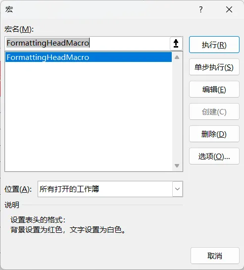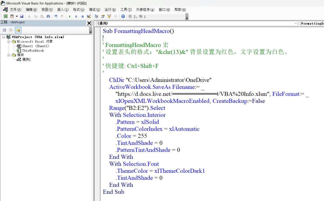 我们看到,Excel 在这部分包括了 Visual Basic 和宏。那么,Visual Basic 和宏有什么不同?简单地说,Visual Basic 是 Excel 中用来编程的语言,而宏则是用来录制用户手工操作步骤的设施,所录制的宏现在也是表示为 Visual Basic 程序。点击“录制宏”,会弹出一个对话框,让你设置一些关于要录制的宏的信息,如图4:你可以在这个对话框中设置宏的一些信息。首先,我们给宏取名 FormattingHeadMacro,表示这是一个格式化表头的宏;其次,设定快捷键,以后我们使用 Ctrl+Shift+F 这个快捷键就可以执行这个宏;然后,选择将宏保存在哪里,这里我们选择默认设置;最后,给出关于这个宏的一些说明性信息,进一步说明这个宏的作用。设置好后,点击确“定”,关闭对话框。此时,因为文件中将要包含宏,当前的文件扩展名(.xlsx)不能表示这种文件格式,所以 Excel 会提示你要将文件另存为包含宏的文件格式,如图5:点击“另存为……”,Excel 会弹出文件保存对话框,在“保存类型”列表中选择“Excel 启用宏的工作簿(*.xlsm)”,如图6:选择好后,点击“保存”,将文件保存为启用宏的文件格式(.xlsm)。此时,“录制宏”的按钮变成了“停止录制”,这说明你随时可以点击这个按钮停止录制。在手工改变表头格式的操作(我们假设你已经熟悉了 Excel 的操作)完成后,点击“停止录制”停止当前宏的录制。这时,录制好的宏就已经保存在文件中了。点击“宏”按钮,会弹出如图7所示的对话框:在这个对话框中,我们可以执行宏,也可以单步执行(单步执行可以看到每一步操作的结果),也可以编辑,如果不需要某个宏,可以点击“删除”将宏删除。点击“选项……”,可以显示当前宏的信息,如图8:可以看出,图8所显示的信息与上面图4所设置的信息是一致的。当然,还可以在这里修改快捷键,以及宏的说明。在图7的对话框上点击“编辑”,则弹出如下图的 VBE(VBE 表示 Visual Basic Editor,以后我们会经常用到这个编辑器),并显示宏的代码:由图可见,我们刚才所录制的宏 FormattingHeadMacro,表示为了 Visual Basic 的代码。这段代码位于名为“模块1”的模块中。下面来详细分析一下宏 FormattingHeadMacro 的代码。首先,宏名 FormattingHeadMacro 表示为 Sub FormattingHeadMacro(),这是一个 Visual Basic 过程,过程名与宏名相同。Sub 表示 Visual Basic 中的一种编程手段,目的是将一段代码组合起来以完成某种特定的功能,End Sub 表示 Sub 的结束。接着,我们给出的说明性信息变成了注释。注释是 Visual Basic 中用来给人阅读的说明性文字,注释本身并不作为代码执行。删除注释并不影响代码的功能。- ChDir 表示改变当前目录到指定的目录 "C:\Users\......“