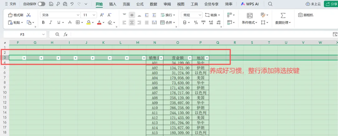 1️⃣将标题行增加筛选框,这里建议选中整行去增加,避免没加筛选的数据错行。