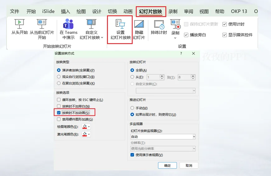 2,在弹出的【设置放映方式】对话框中,找到【放映选项】区域,勾选【放映时不加动画】点击确定就搞定啦!
