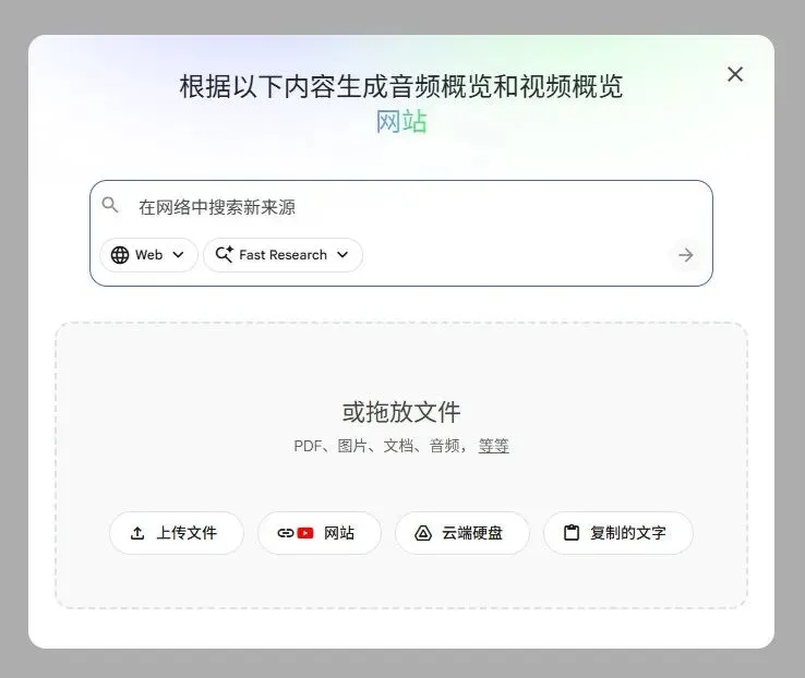 这里面可以通过AI进行搜索,搜索区域分为两部分:Web和云端硬盘。如果局限在自己的特定文档,也可以在下方的区域添加PDF、图片、文档、音频等等,也可以自己复制文字均可。