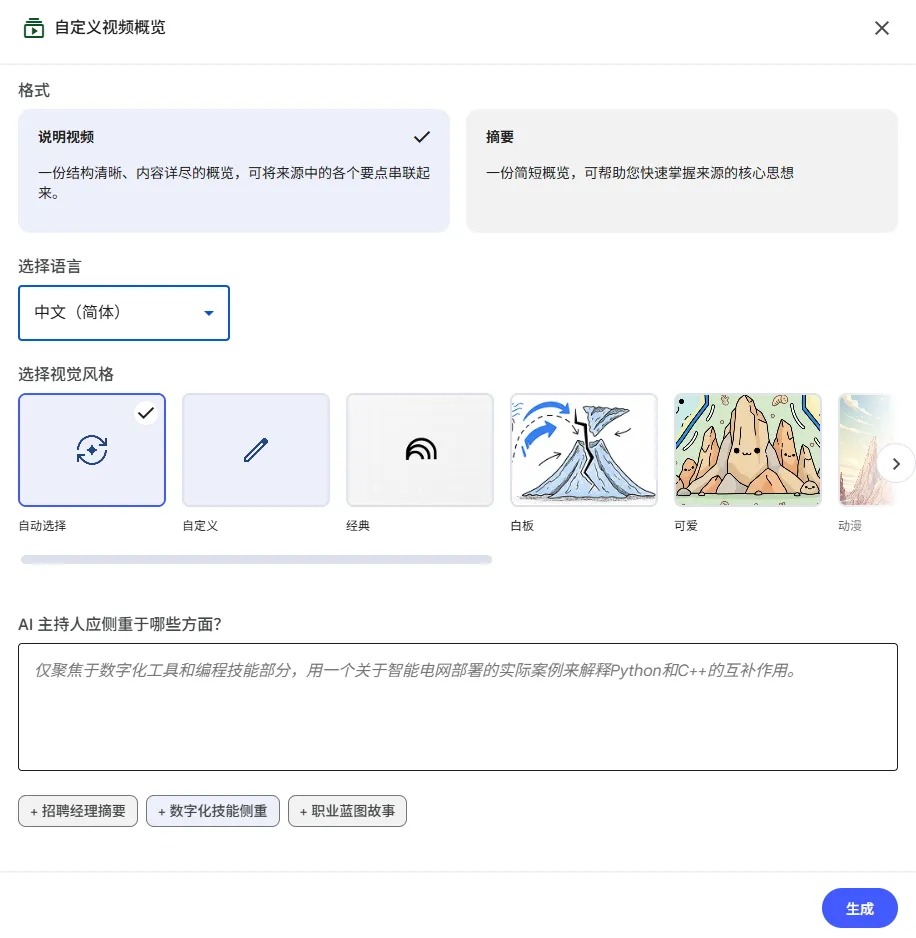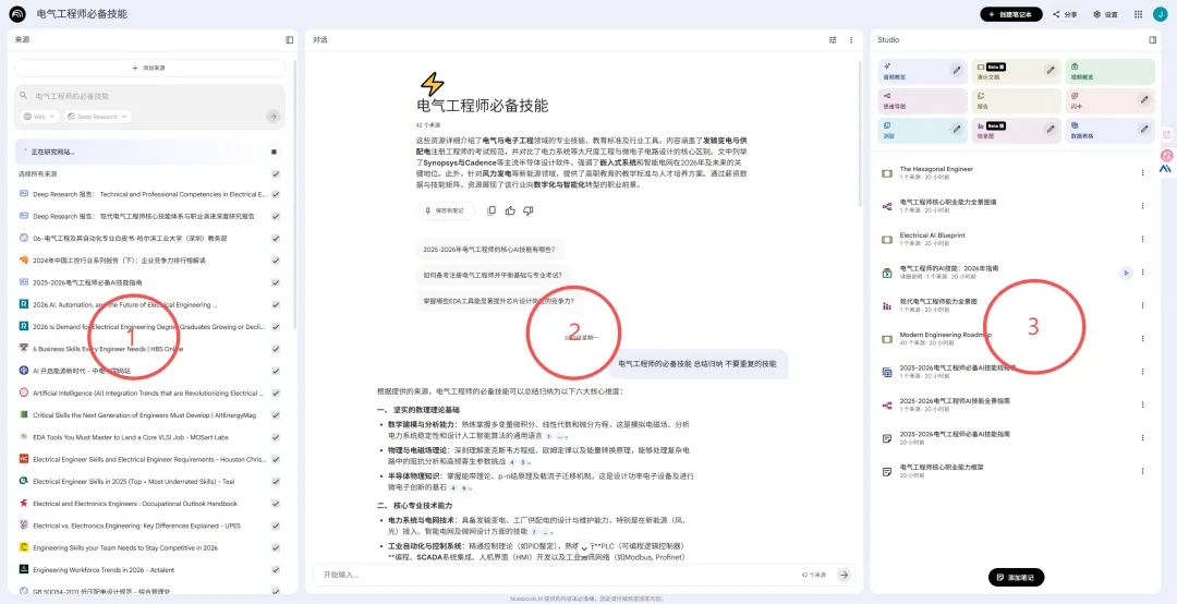 我们对来源如果比较满意后,可以全选先,然后进入对话框,默认会先给一段摘要,即对所有来源做大概的总结: