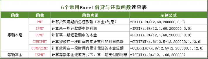 =PMT(各期利率, 总付款期数, 贷款本金, [未来值], [付款时间])Excel里藏了个“月供计算器”,用Excel的PMT函数,3秒算出贷款要还多少!=PMT(4.8%/12,60,200000,0,0)=IPMT(各期利率, 指定的期数, 总付款期数, 贷款本金, [未来值], [付款时间])Excel IPMT函数:一分钟算出你的月供里有多少是利息=IPMT(4.8%/12,1,60,200000,0,0)=PPMT(各期利率, 指定的期数, 总付款期数, 贷款本金, [未来值], [付款时间])Excel贷款计算神器:PPMT函数,一眼看穿你还了多少本金=PPMT(4.8%/12,1,60,200000,0,0)=CUMIPMT(各期利率, 总付款期数, 贷款本金, 开始期数, 结束期数, 付款时间)财务人必看:CUMIPMT累计利息函数详解,轻松搞定贷款利息计算=CUMIPMT(4.8/12,5*12,200000,1,12,0)=CUMPRINC(各期利率, 总付款期数, 贷款本金, 开始期数, 结束期数, 付款时间)财务人必看:CUMPRINC累计本金函数详解,如何快速知道已还多少本金?=CUMPRINC(4.8/12,5*12,200000,1,12,0)=ISPMT(各期利率, 指定的期数, 总付款期数, 贷款本金)【Excel干货】ISPMT函数详解:等额本金还款,利息这样算!=ISPMT(4.8%/12,1,60,200000)