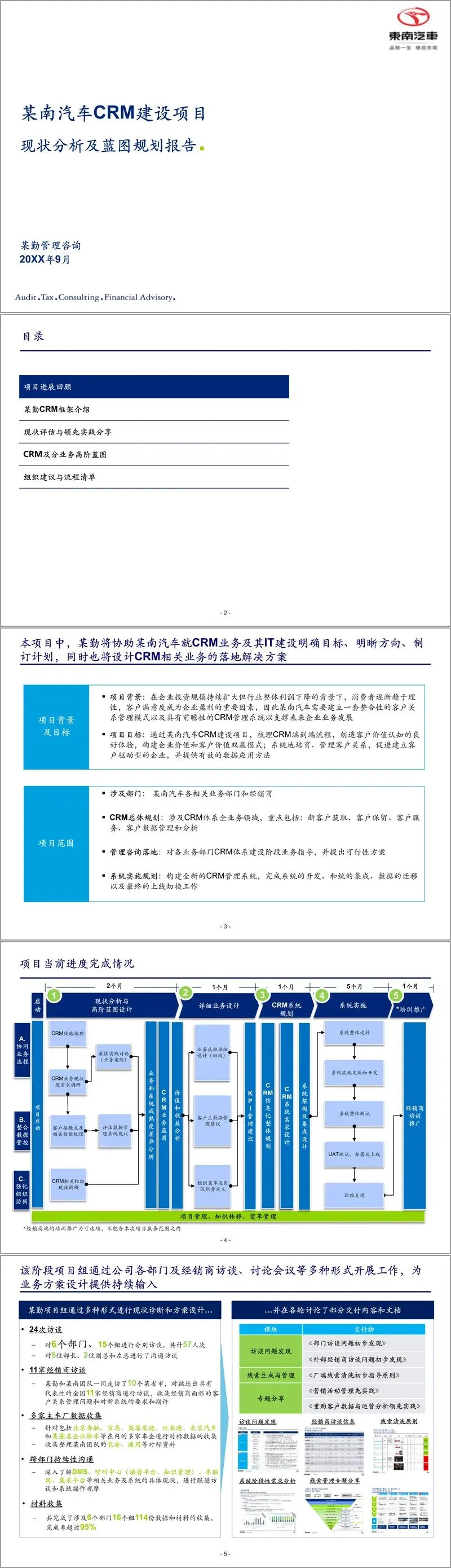 项目团队通过深入调研开展工作,包括对某南汽车6个部门15个组的24次访谈(共计57人次),以及对5位部长、2位副总和总经理的沟通。此外,团队还走访了10个省市,对全国11家具有代表性的经销商进行了访谈,并收集了包括北京奔驰、宝马、英菲尼迪、比亚迪等多家主流车企的对标数据,完成了涉及6个部门16个组114份材料的收集,完成率超过95%,为现状分析提供了坚实依据。