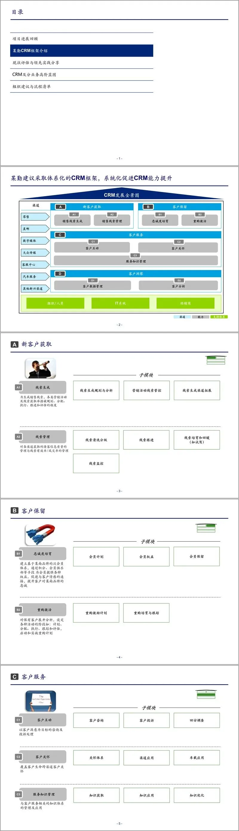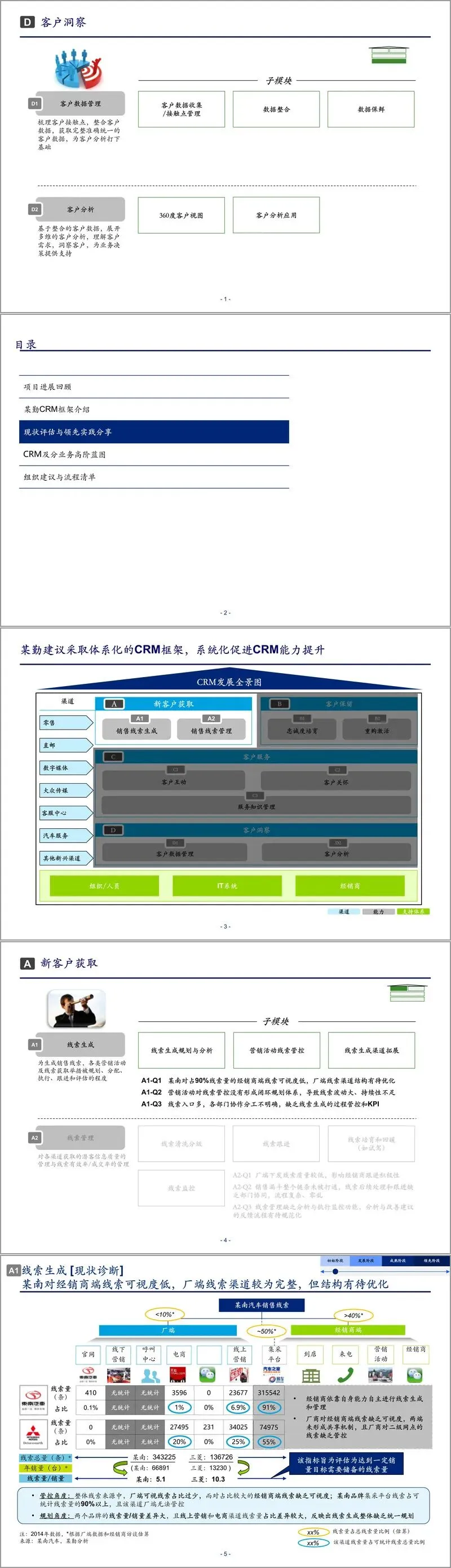 具体到各业务模块,报告给出了详细的规划建议。新客户获取方面,需加强线索生成的规划与渠道结构优化,建立线索清洗、分级、下发、跟进、培育和分析的闭环管理体系,并强化厂端与经销商的协同。客户保留方面,应着手建立基于某南品牌的泛会员体系,通过积分、会员俱乐部等手段提升客户黏性,并设计科学的客户画像和精准营销流程来激活重购。客户服务方面,目标是整合呼入呼出业务,建立集约化、精细化的客户互动中心,完善客诉处理流程和跨生命周期的客户关怀体系,并构建有价值的服务知识库。客户洞察方面,核心是建立客户数据管理规范,提升数据质量,整合形成360度客户视图,并在此基础上开展多维客户分析,为业务决策提供支持。