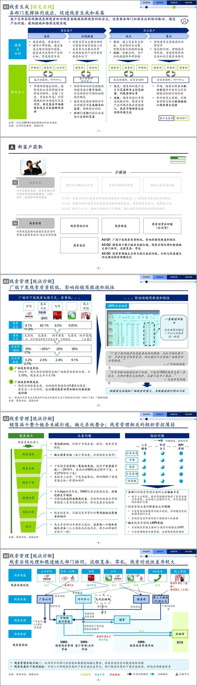 在新客户获取环节,现状诊断发现三大核心问题。首先,销售线索生成方面,某南对占总量90%的经销商端线索可视度极低,厂端线索渠道结构有待优化。营销活动缺乏闭环规划,导致线索波动大、持续性不足,且线索入口众多,部门间协作分工不明,缺乏过程管控和关键绩效指标。其次,线索管理环节问题突出,厂端下发的线索质量较低,影响了经销商的跟进积极性。销售漏斗链条未打通,线索后续处理缺乏部门协同,流程复杂零乱,同时系统缺乏分析与执行监控功能。