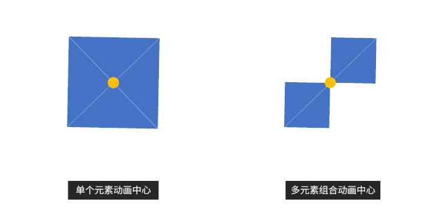 通过上图不难看出,动画中心其实就是设定动画的对象,不论动画对象是单个元素,还是多元素组合对象,动画效果都是围绕它的中心位置进行运动。