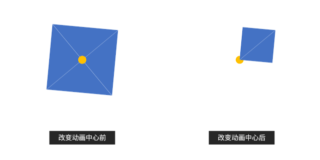 改变动画中心的原理,其实就是通过多元素组合,给这个组合添加动画,然后把这个组合中的一个或多个元素隐藏掉,从而产生动画中心位置改变的效果。