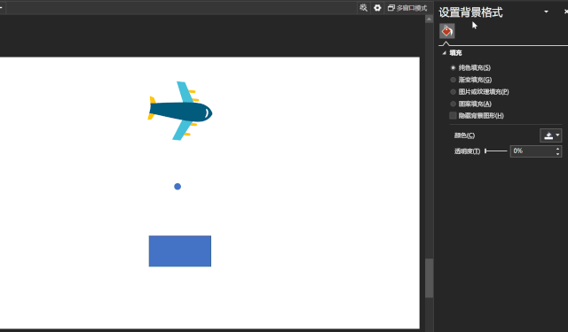 我们只需要复制一个飞机(或者插入任何一个形状均可),摆放在以这个圆为中心的对称点即可,为了方便隐藏对称的图形,我们用形状替代(可直接设置为无填充)。