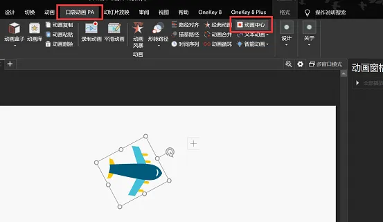 首先,选中需要改变动画中心的元素,点击“口袋动画插件”-“动画中心”。