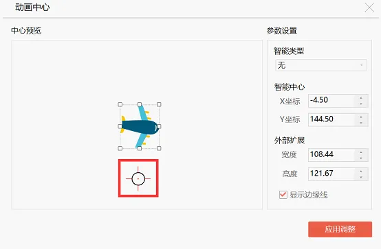 然后在弹出的窗口中,直接将动画中心移动到自己需要的位置,点击应用调整即可。