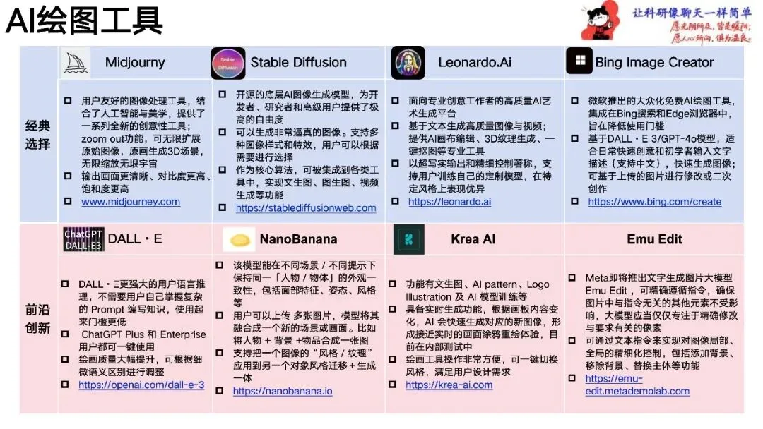 - 经典选择 Midjourney:用户友好的图像处理工具,结了人工智能与美学,提供了系列全新的创意性工具。 Stable Diffusion:开源的底层AI图像生成模型,为开发者、研究者和高级用户提供了极大的自由度以生成非常逼真的图像。 Leonardo.Ai:专业创意工作者的高质量AI艺术创作平台,文本生成高质量图像与视频。 Bing Image Creator:微软推出的大众化免费AI绘图工具,集成在Bing搜索和Edge浏览器中,旨在降低使用门槛。