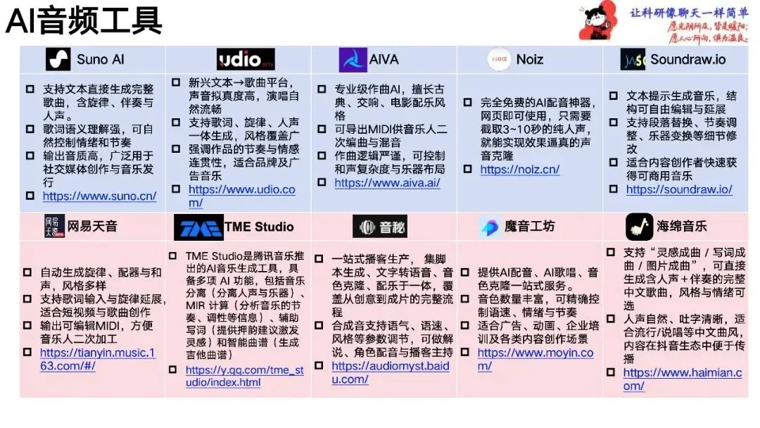 - Suno AI 特点:支持文本直接生成完整歌曲,含旋律、伴奏与人声,歌词语义理解强,可自然控制情绪和节奏。 功能:输出音质高,广泛用于社交媒体创作与音乐发行。 链接:https://www.suno.cn/ 2.ydio BETA 特点:新兴文本→歌曲平台,声音拟真度高,演唱自然流畅,支持歌词、旋律、人声一体生成,风格覆盖广。 功能:强调作品的节奏与情感连贯性,适合品牌及广告音乐。 链接:https://www.udio.co