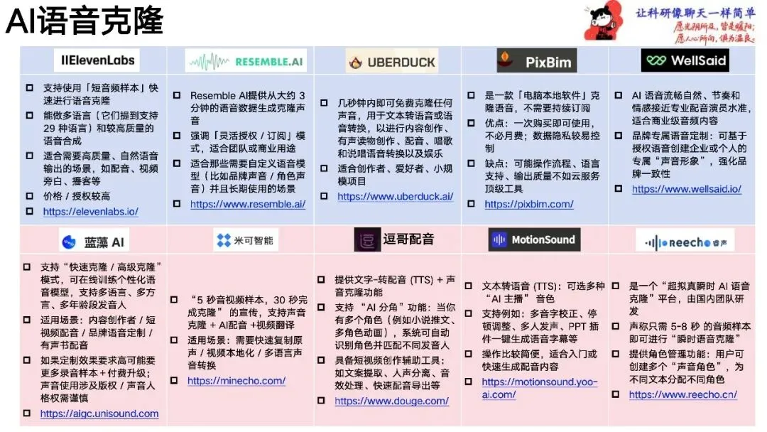 - IElevenLabs 特点:支持使用「短音频样本」快速进行语音克隆,能做多语言和较高质量的语音合成。 功能:适合需要高质量、自然语音输出的场景,如配音、视频旁白、播客等。 链接:https://elevenlabs.io/