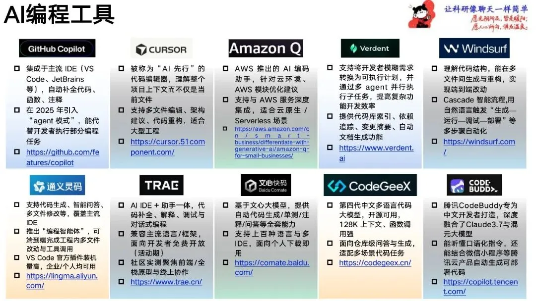 这篇文章详细介绍了各类AI工具及其在各个领域的应用,涵盖了从主流通用语言模型到AI绘图工具、AI综合视觉工具、AI变美工具、AI音频工具、AI语音克隆、AI剪辑工具、AI虚拟人工具、AI编程工具、AI搜索工具、AI科研工具、AI PPT生成、AI文本检测工具、AI内容审核工具、AI网络防护、AI老年看护、AI设计工具、AI游戏工具、AI情感陪伴、AI求职招聘、AI会议辅助、AI法律助手、AI智驾工具、AI金融工具、AI宠物生活、AI塑身运动、AI医疗健康、AI电商营销、AI私域运营、AI客户服务、AI供应链管理、AI人力资源管理、AI农业管理、AI语言翻译等多个方面。以下是文章的主要内容: