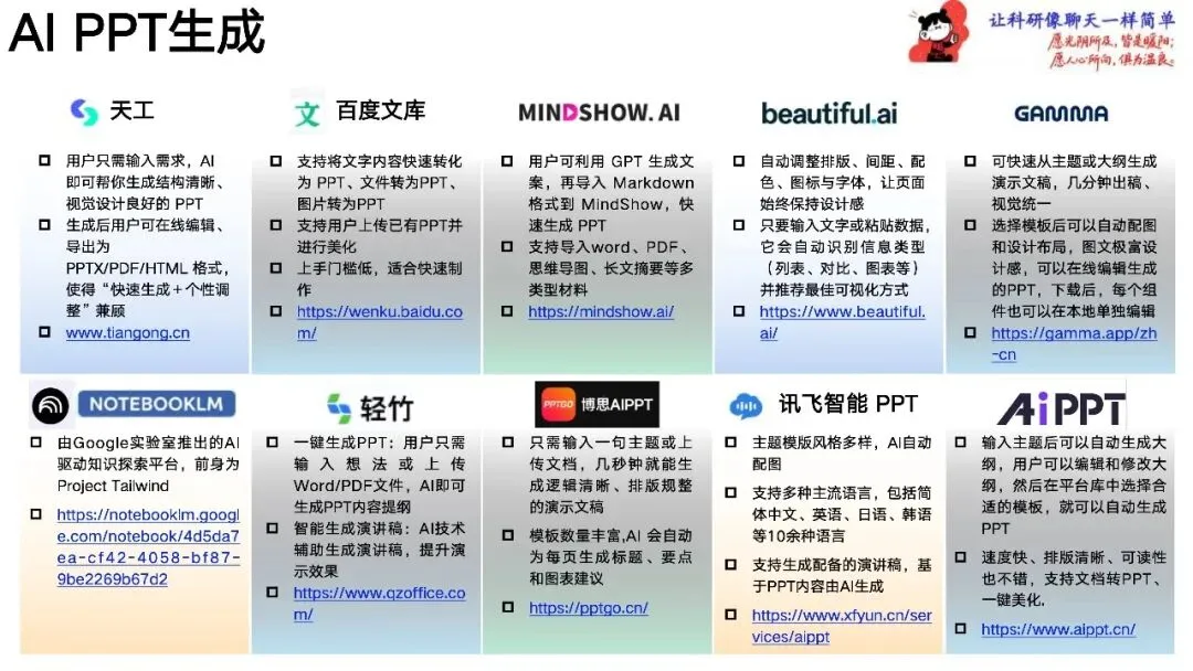 - 天工 特点:用户只需输入需求,AI即可帮你生成结构清晰、视觉设计良好的PPT。 功能:生成后用户可在线编辑、导出为PPTX/PDF/HTML格式。 链接:https://www.tiangong.cn/