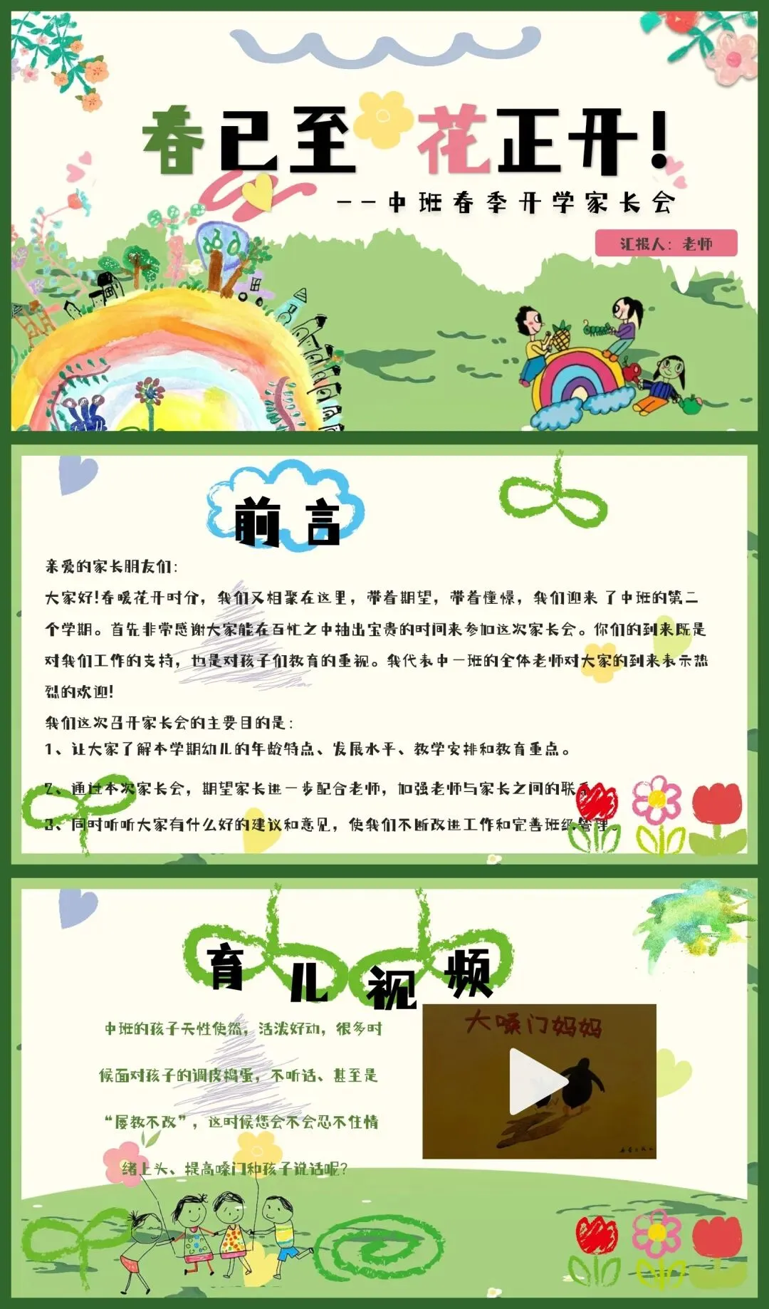 会 亲爱的家长朋友们: 大家好 ! 春暖花开时分,我们又相聚在这里,带着期望,带着憧 憬, 我们迎来了中班的第二个学期。首先非常感谢大家能在百忙之中 抽出宝贵的时间来参加这次家长会。你们的到来既是对我们工作的支 持, 也是对孩子们教育的重视。