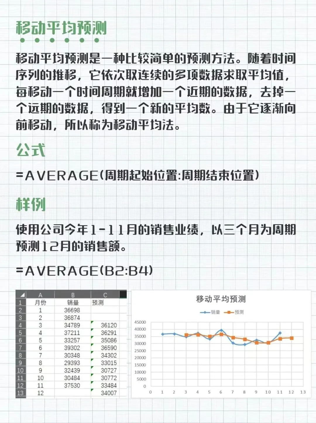 ▪️移动平均预测是一种比较简单的预测方法。随着时间序列的推移,它依次取连续的多项数据求取平均值,每移动一个时间周期就增加一个近期的数据,去掉一个远期的数据,得到一个新的平均数。移动平均可以让数据更平滑,消除周期变动和不规范变动的影响,使得长期趋势得以显示,因而可以用于一些周期变动较小的预测。