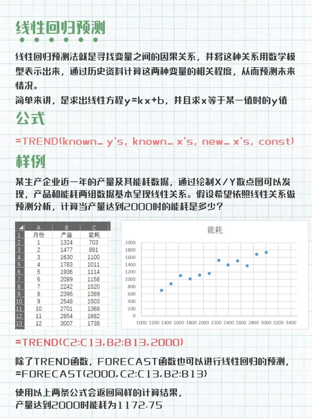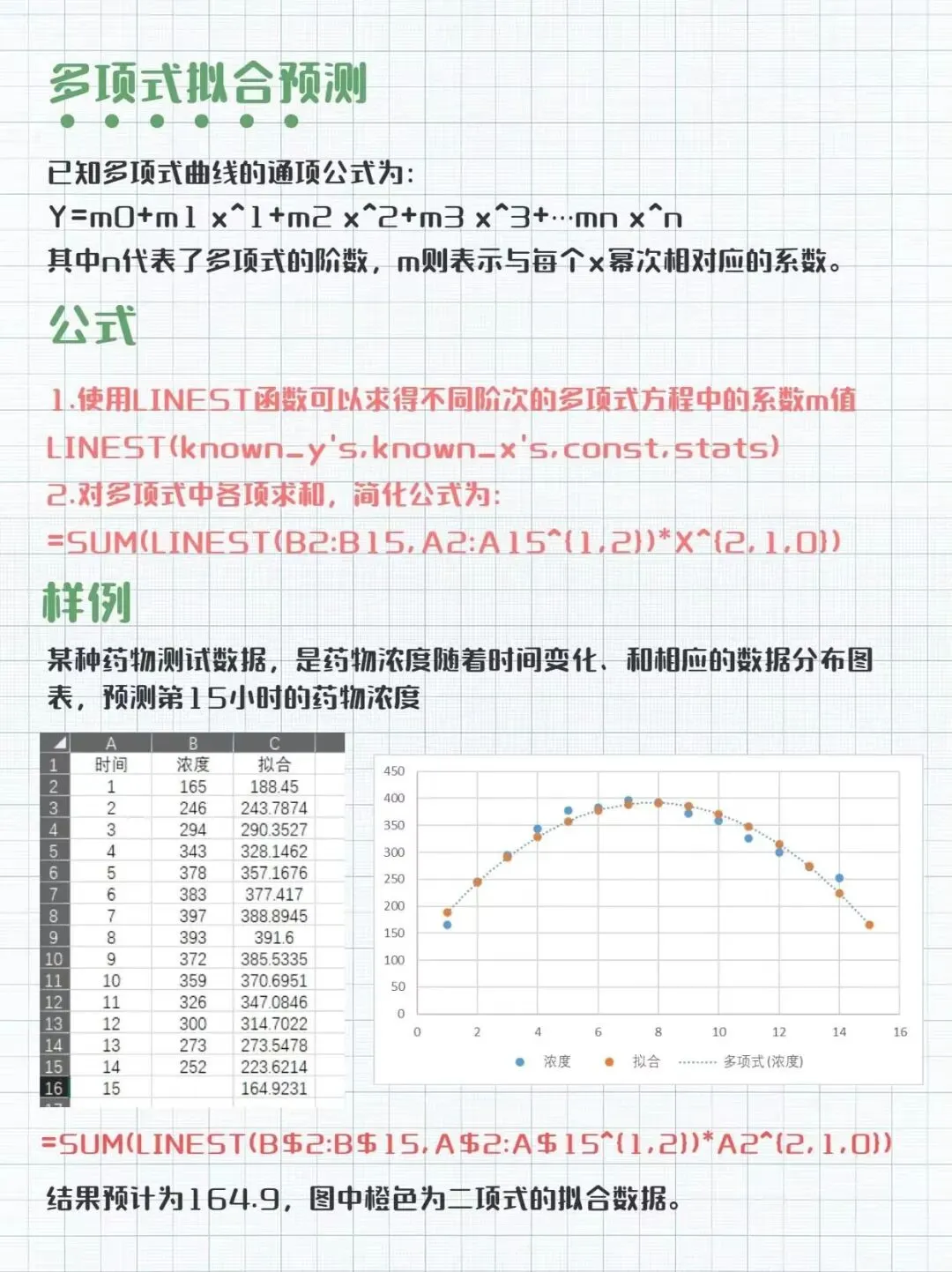 ▪️真实案例中,数据自变量和因变量往往有非常复杂的关系,通常会表现出y = m1x1 + m2x2 + ... + b的形式,excel中LINEST 函数可通过使用最小二乘法计算与现有数据最佳拟合。