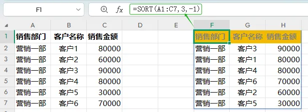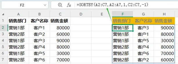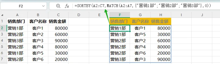 F2=SORTBY(A2:C7,MATCH(A2:A7,{"营销1部";"营销2部";"营销3部"},0))