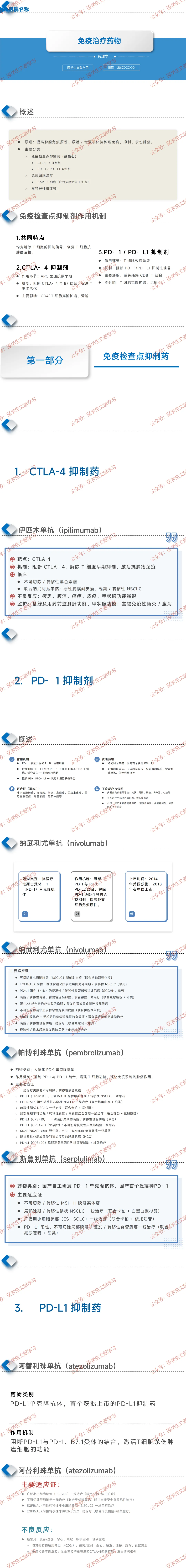 - 代表药物:纳武利尤单抗(国内首个获批)、帕博利珠单抗、卡瑞利珠单抗、斯鲁利单抗(国产首个泛癌种 PD-1)等