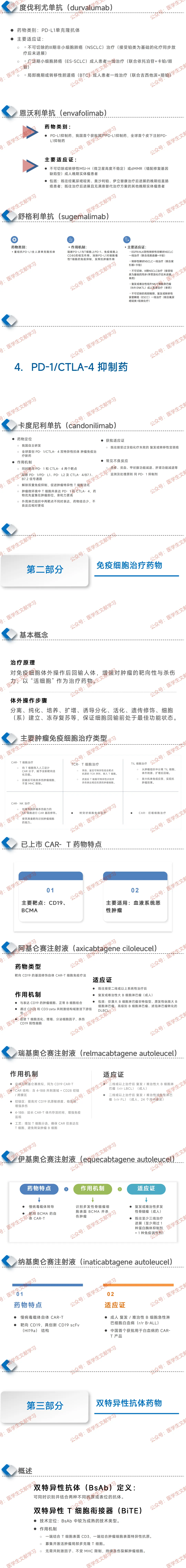 - 度伐利尤单抗:适用于 Ⅲ 期不可切除 NSCLC、广泛期小细胞肺癌、胆道癌等