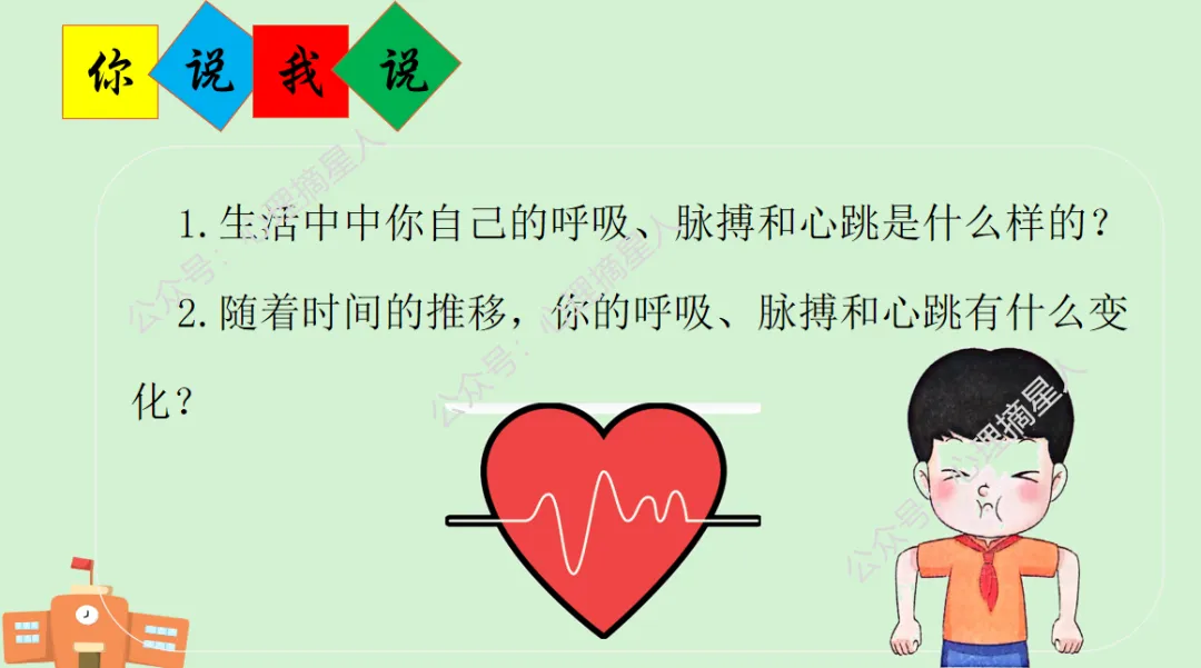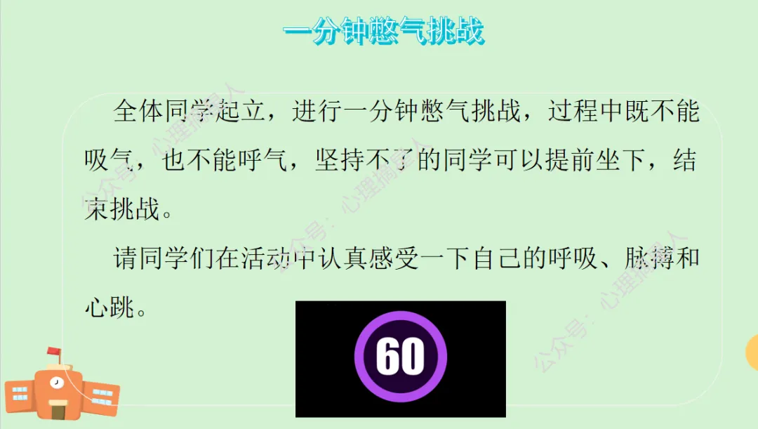 “一分钟憋气挑战”的活动能够迅速调动课堂氛围,提高学生上课的积极性。学生在分享自己憋气时呼吸、脉搏和心跳变化的过程中,深刻感知生命,从而导入课题。
