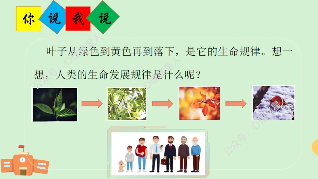 通过引导学生阅读故事,启发学生思考,帮助学生认识到生老病死是生命发展的自然规律。