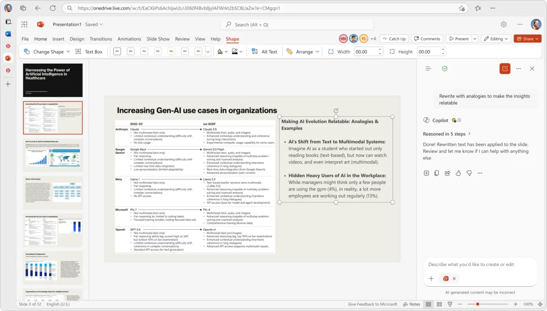 微软宣布 PowerPoint 迎来重大 AI 升级 —— 将使用智能体模式(Agent Mode)重塑 Copilot 体验,以支持重写、翻译和演讲者备注功能。这些增强功能将支持更智能的多步骤推理,并允许用户在直接对演示文稿执行操作的同时,通过聊天与 Copilot 交互。