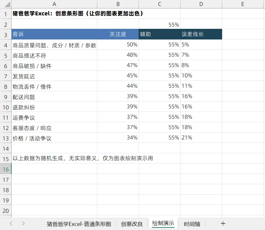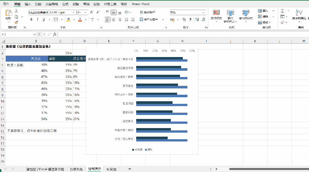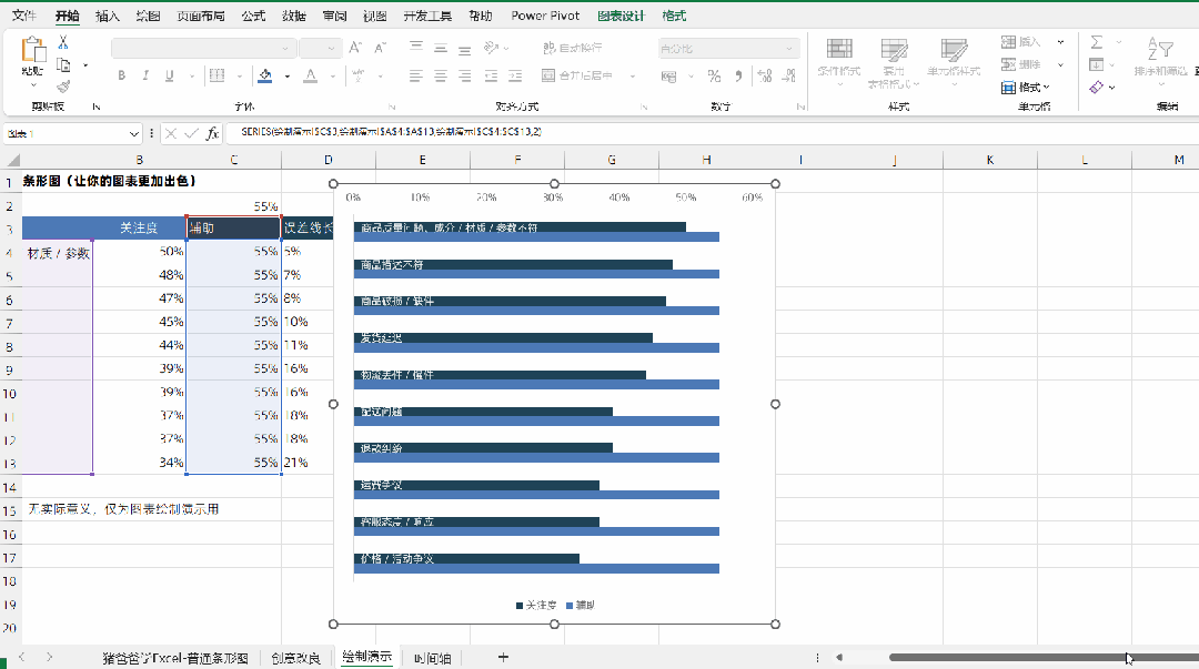 这一节是猪爸爸学excel标准/基础图表之条形图创意美化篇1、当标签过长时,会占据图表过多的区域,不够美观,解决方法是将标签放到条形中,这个之前有分享过类似的技巧。2、各类别占比,之前是跟在条形右侧,这次为了更为简洁,将占比(百分比)标签放置保持垂直方向一致,整体显得更加有秩序之美。现在,让我们一起来将左侧的条形图,修改为右侧这款创意条形图哈。现在,让我们在C列增加一列辅助数据,C2单元格公式=MAX(B4:B13)*1.1,将B列最大值再稍等放大一点点,(这样子等会第一个条形才能也有指示线条),接着C列的数据,就都引用C2单元格的数据即可。而D列为误差线长,D4单元格公式=$C$2-B4,这个是等会绘制“指示线”需要的哈。选择A3:C13数据区域,【插入】-【条形图】,生成图表。条形图生成之后,习惯第一步,点击垂直轴,右键【设置坐标轴格式】,调出设置窗格,在设置窗格的【坐标轴选项】选项卡,找到【逆序类别】并进行勾选,这样子,垂直轴标签的顺序,才能与数据源保持一致。再接着,就是老规矩,点击快捷按钮【图表元素】,取消【图表标题】与【网格线】的勾选,让图表更为简洁。现在,让我们先选中“关注度”系列条形,右键【添加数据标签】,为其添加标签,点击选中该组标签,在设置窗格的【标签选项】选项卡,【标签包括】勾选【类别名称】,取消【值】的勾选,再设置【标签位置】为【轴内侧】,可以见到,类别标签就放置到条形右侧了。可以,因为字体颜色与条形颜色接近,所以看不大清楚,这个很简单,将标签字体颜色设置为白色就好了。再接着,就可以选中垂直轴,在设置窗格的【坐标轴选项】处,找到【标签】-【标签位置】,设置为【无】,将占据太多位置的标签给隐藏起来。现在,条形是两两相邻的,我们需要改变它们的位置,点击任意条形系列,在设置窗格的【系列选项】处,设置【系列重叠】为100%,【间隙宽度】则为50%左右即可,这样子,“拥挤”的条形,瞬间就感觉舒服多了。但是,我们发现“辅助”条形,将“关注度”条形全部挡住了,这样子可是不对的。点击选中“辅助”条形(通过点击,现在也只能选到它了),在【填充与线条】选项卡,设置【填充】为【无填充】,“关注度”系列又“重见天日”了。点击选中“辅助”系列,右键【添加数据标签】,因为该系列的条形都是一样长的,所以这组数据标签,在垂直方向就都是对齐的,这样子感觉就很有规律。当然,美中不足的是,这组标签的值也都是一样的,这样就不行了,得怎么办呢?小伙伴们肯定已经想到了。点击选中该组标签,在设置窗格的【标签选项】,勾选【单元格中的值】,选择数据标签区域为对应的B4:B13区域就可以了哟。现在,我们利用误差线来制作引导线,先通过设置窗格下拉选择“关注度”系列,在快捷按钮【图表元素】处勾选【误差线】,为该系列添加误差线。点击该组误差线,在设置窗格的【误差线选项】选项卡,【方向】为【正偏差】,【末端样式】为【无线端】,而【误差量】为【自定义】指定值,【正错误值】为D4:D13数据区域,【负错误值】为0即可。如有必要,可以再来到【填充与线条】选项卡,将【线条】设置为【实线】,设置适当的【颜色】,也可以将【短划线类型】设置为【短划线】,这样子就是虚线的样式了。至此,图表基本上就完成了,其他细节,就不再一一赘述了哈。因不少小伙伴想要课件跟着练习,故提供本文练习图表课件下载(仅提供部分文章课件不包含图表哟):现在,最最重要的事情,随手点个赞,给个爱心推荐一下呗,传播爱心让更多的人知道,比心~~