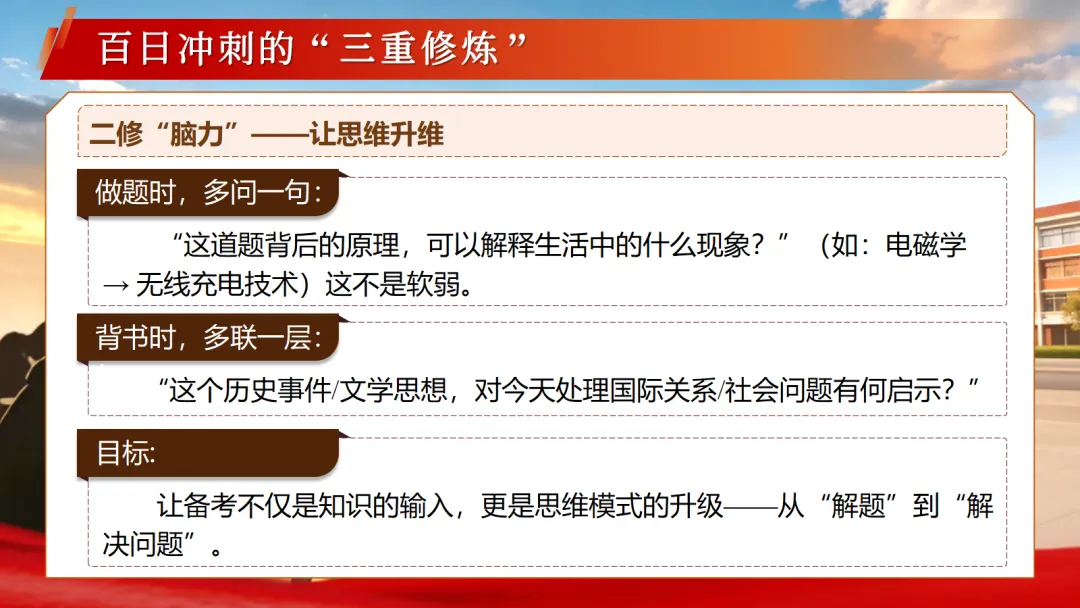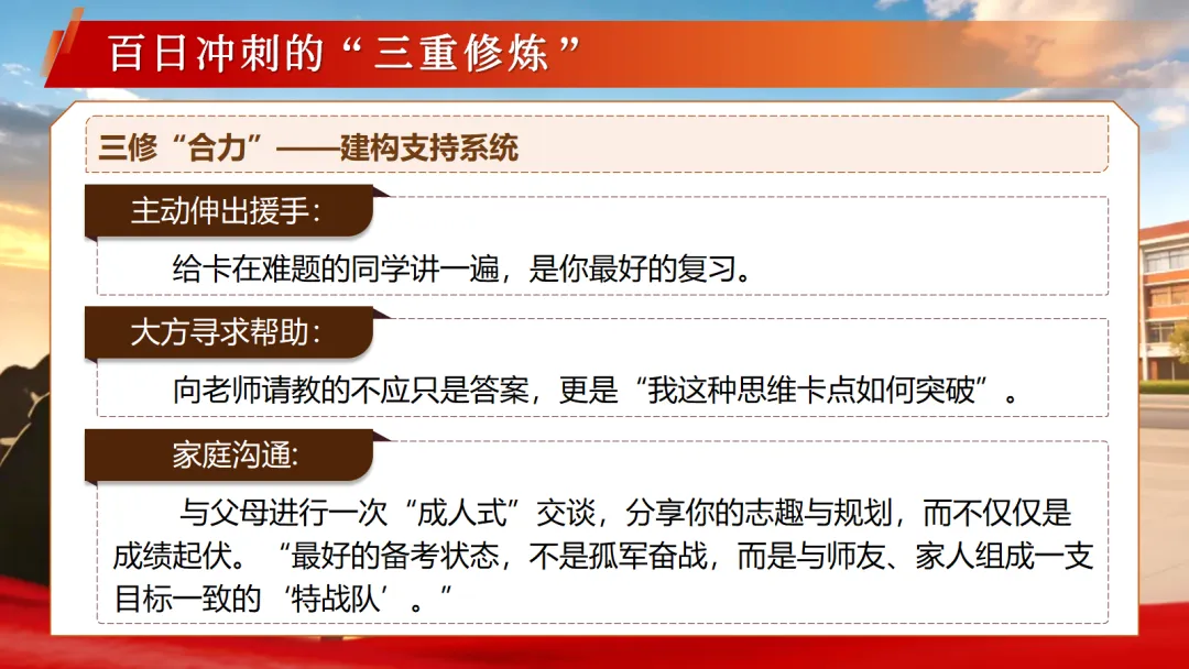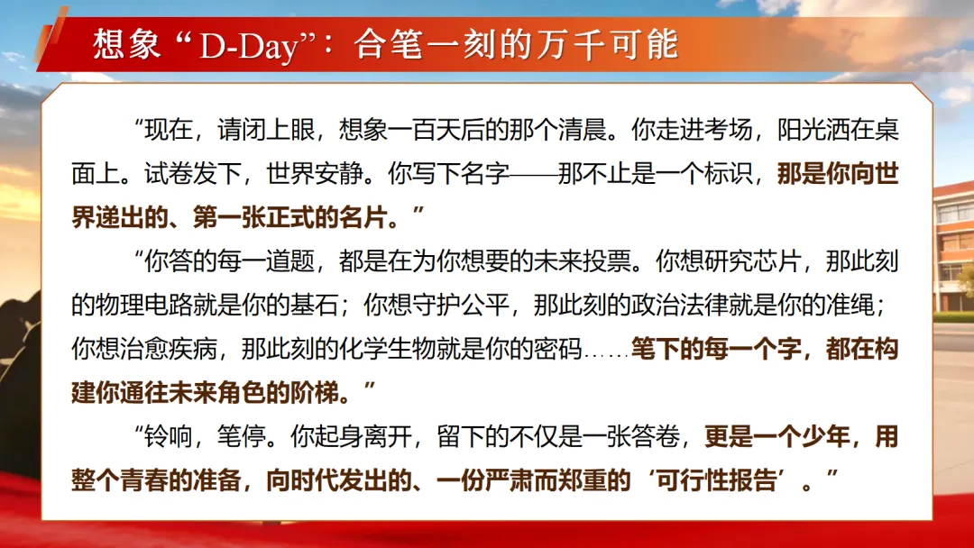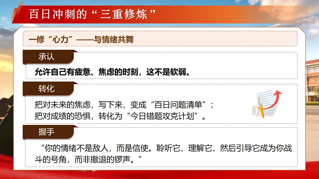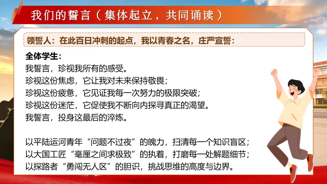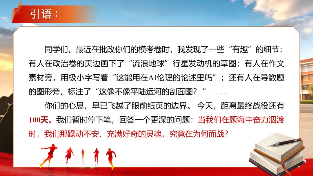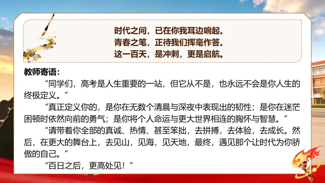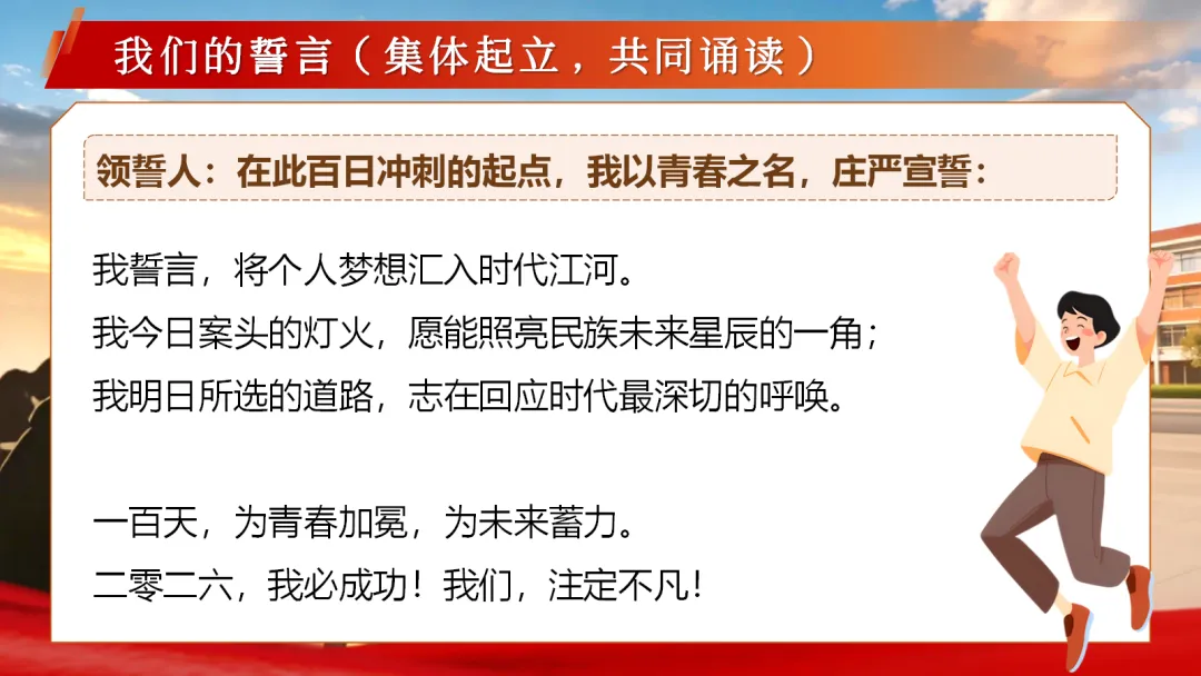 大家好,我是小诗老师!今天小诗老师给大家分享的是:2026春——【高三】高考百日誓师主题班会PPT:百日奔赴,执笔为刃,可直接保存打印。高清原图无水印,可直接打印使用。完整PDF电子版网盘下载链接详见页面底部,欢迎收藏和下载。如果觉得这份资料不错,建议分享到班级群/年级群,让其他家长打印出来,帮助孩子学习。