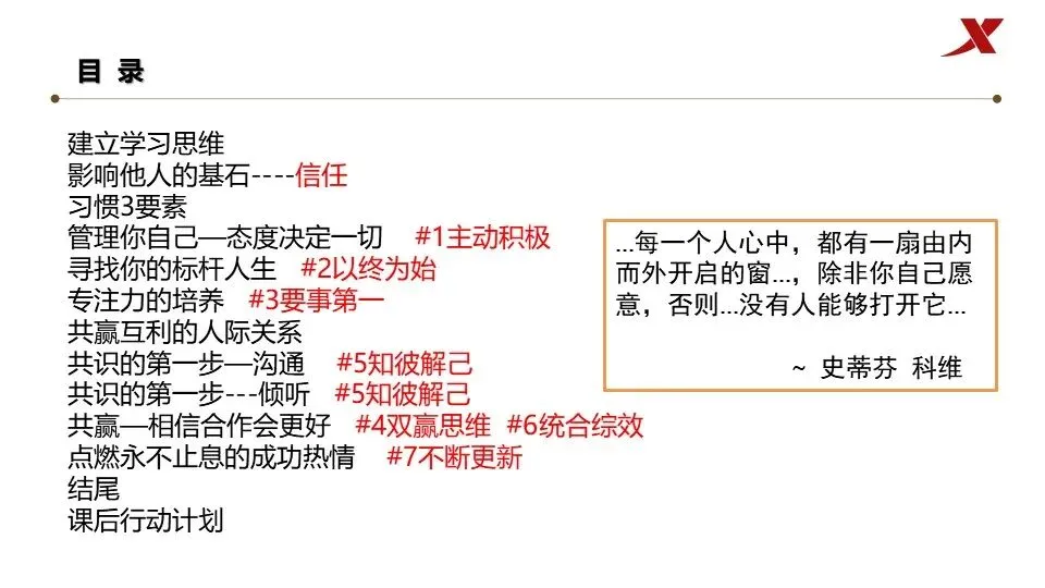 当前位置:首页>PPT>PPT ‖ 安全领导力培训专题41-赢在核心领导力——高效能人士的七个习惯(70页)
