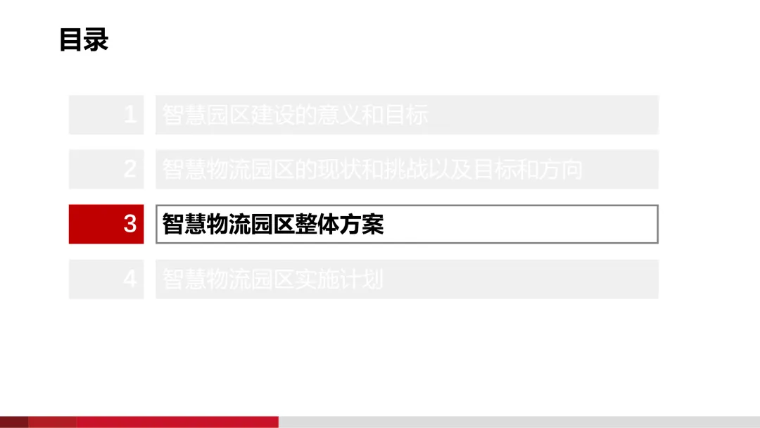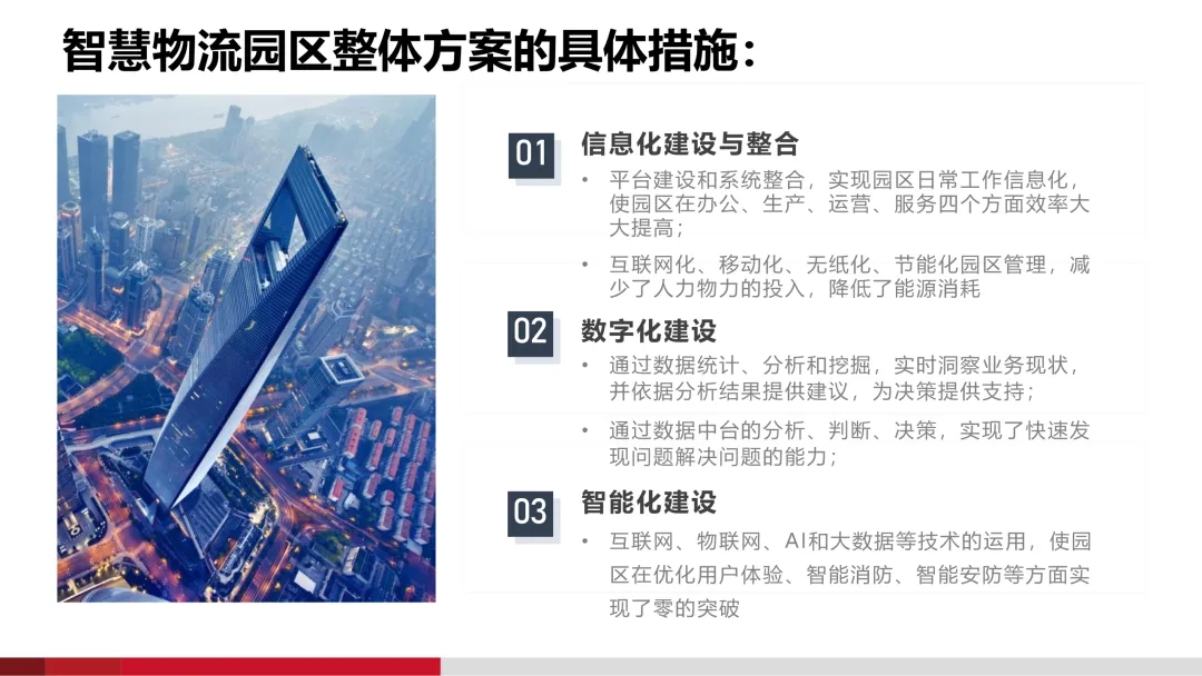 首先,方案强调了智慧园区建设的多重意义,包括提升园区竞争力、打造综合性服务平台、促进城市发展战略实施等。通过引入云计算、物联网、大数据、人工智能等先进技术,实现园区运营管理的智能化、精细化,从而占据价值链高端,提升整体业绩。同时,方案还注重园区的可持续发展,通过节能减排、绿色建设等措施,打造环境友好型的物流园区。