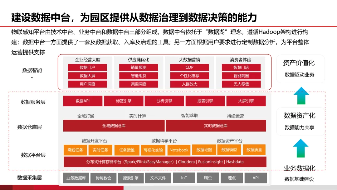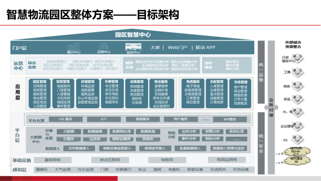 针对物流园区的现状和挑战,方案提出了明确的发展目标和方向,即降本增效、智能化、节能化。通过构建物联感知平台、数据中台、技术中台等核心基础设施,实现园区数据的全面采集、深度分析和智能应用。这些平台将作为园区的“神经中枢”,为园区管理提供精准的数据支持和智能决策依据。