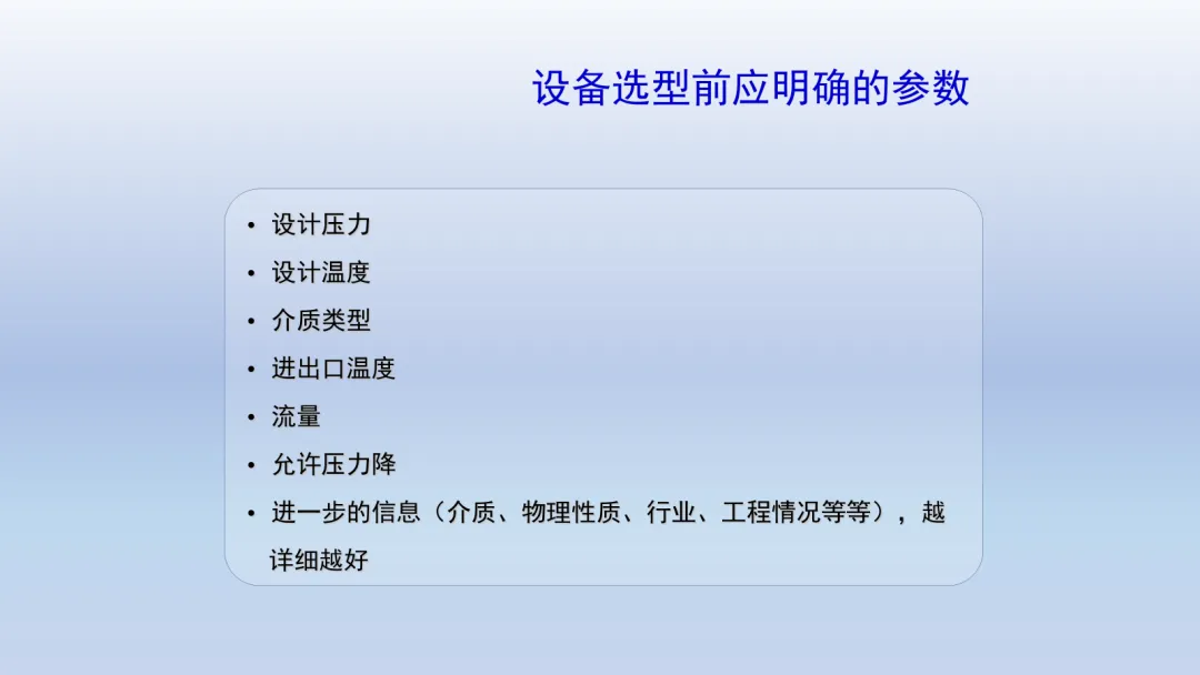 传热值/平均温差/换热面积/效率计算,换热器参数-计算表,主要包含换热器冷热两侧传热值/平均温差/换热面积/效率计算,管壳式换热器、板式换热器参数计算,换热器重量计算,反应釜热量平衡及传热面积计算等。 如需了解计算详情,可点击以下链接进入:免责声明:本文分享的PPT文件,来自某公司的培训资料,由小编编辑整理,发布此文仅供学习。版权归原作者所有,如涉及作品版权问题,请您告知我们将及时删除!你的认可是小编和工艺小课堂的动力!